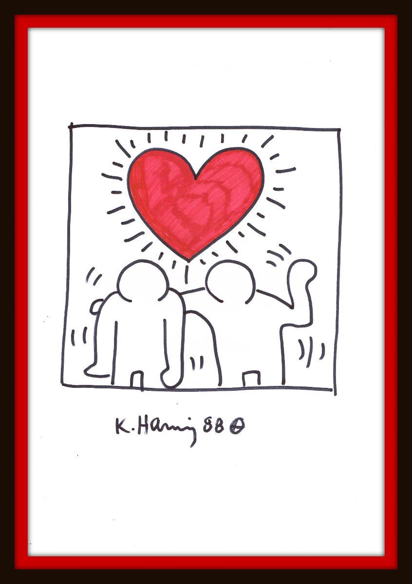 A drawing of two men holding a heart, partly coloured. Signed and drawn by Keith Haring. Paper: 14x10 inches. Professionally mounted and framed in wood. Supplied with coa. Conditon: Very good.