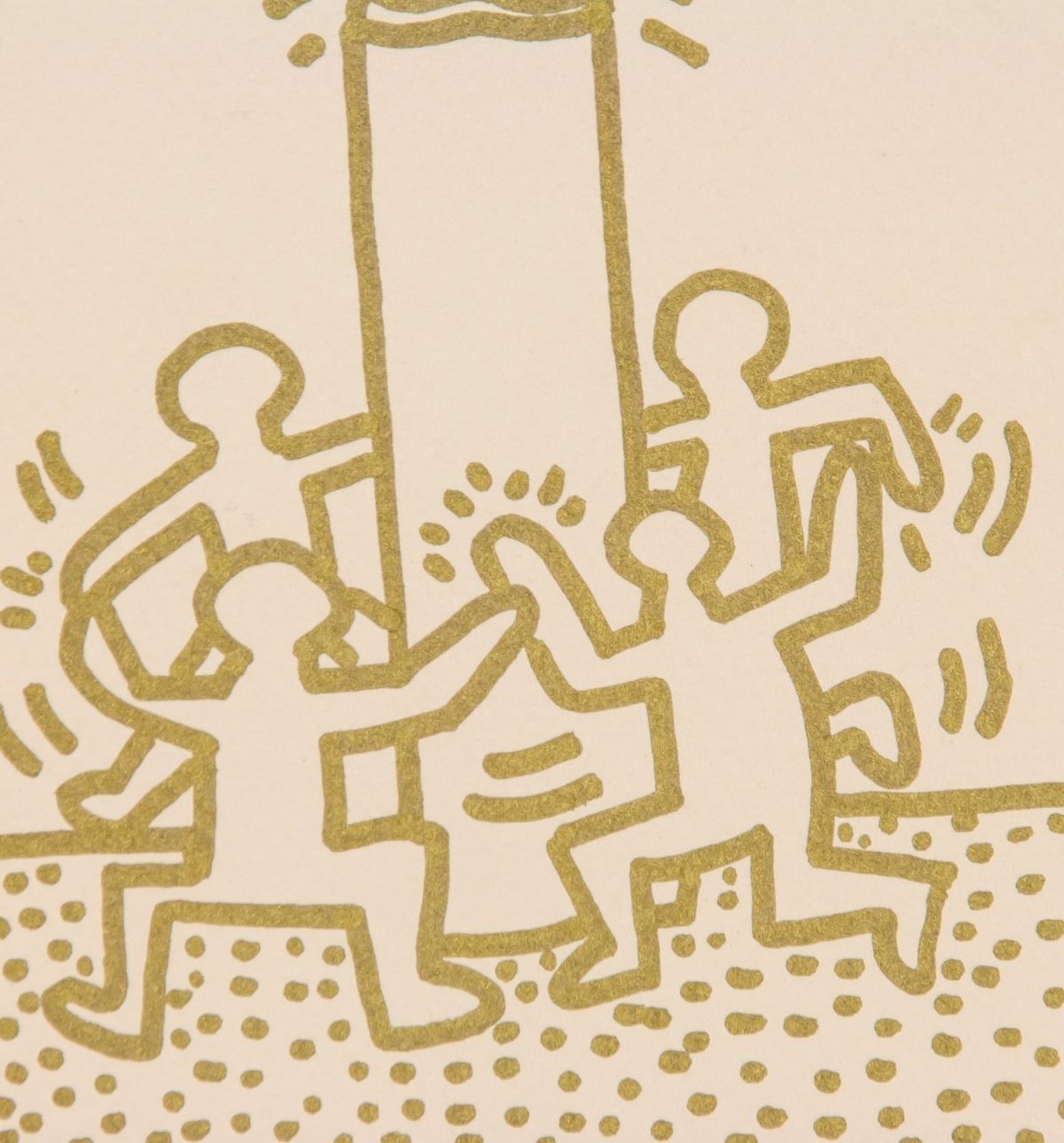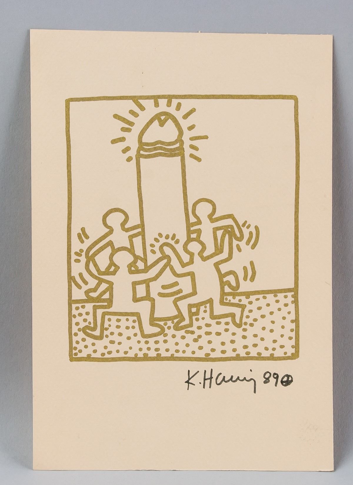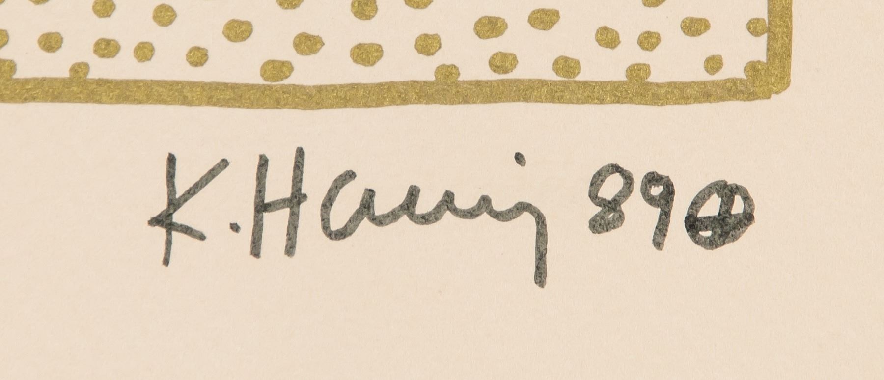 Gold ink marker on paper. Featuring a pop art. Signed and attr. Keith Haring (American, 1958-1990) on the lower right corner. 22 x 15 cm (8.7 x 5.9 inches) Haring developed a distinct pop-graffiti aesthetic centered on fluid, bold outlines against a dense, rhythmic overspread of imagery like that of babies, barking dogs, flying saucers, hearts, and Mickey Mouse. In his subway drawings and murals, Haring explored themes of exploitation, subjugation, drug abuse, and rising fears of nuclear holocaust.