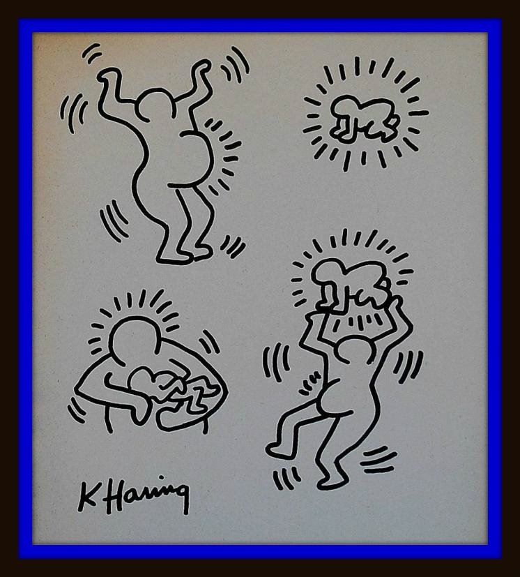 A rare Keith Haring drawing of womanhood showing the pregnant woman, woman with baby, the typical person holding radiant baby (but with the pregnant woman) and lastly radiant baby. Provenance: Supplied with coa. Professionally mounted and framed in wood.