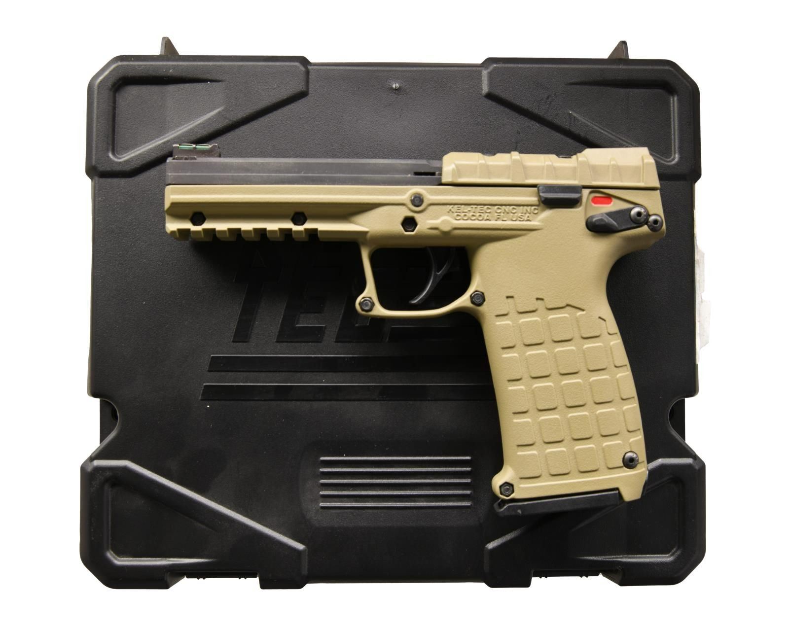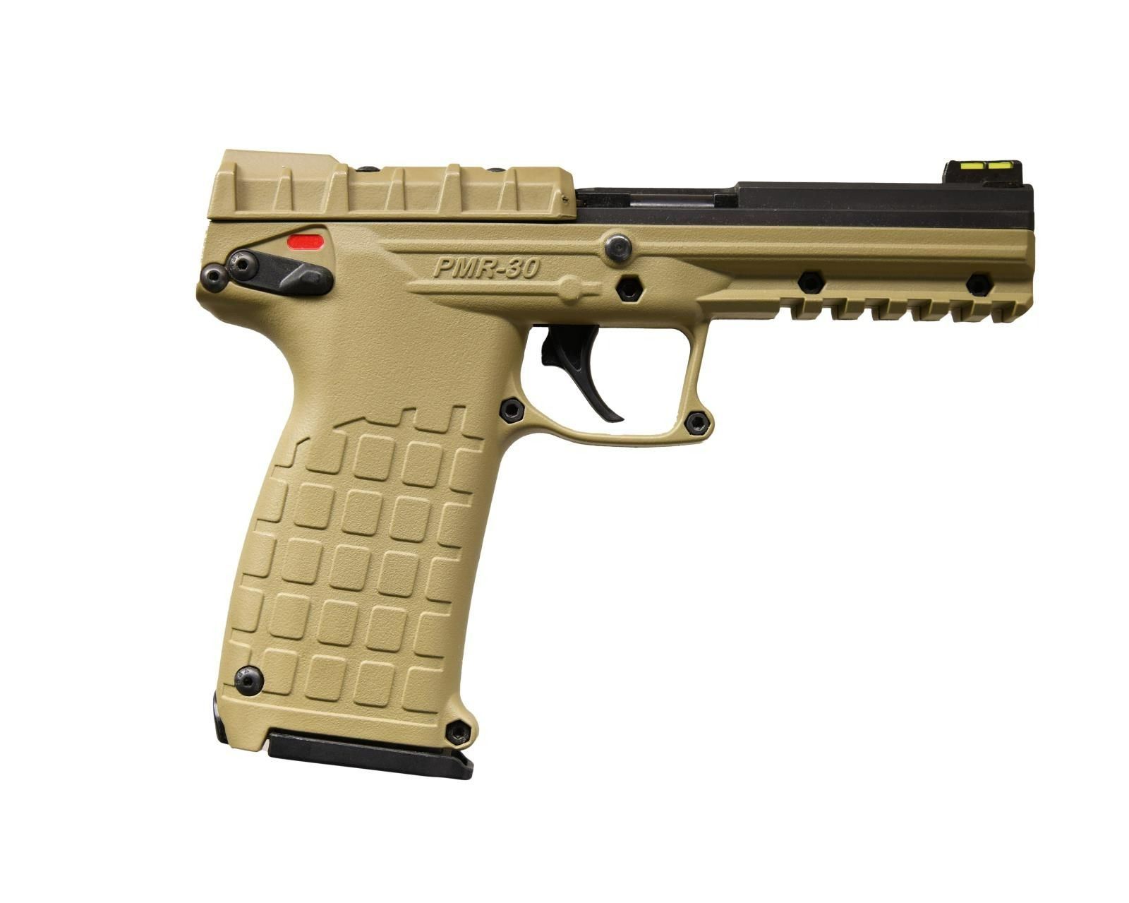 FACTORY CASE. Cal. 22 WMR. S# WWYA26. Bbl. 4 1/4". PMR-30 semi-automatic pistol mfg. by Kel-Tec. Left side of frame is marked with Kel-Tec's mfg. information, with the model designation on the right, and the S# and cal. designation marked on the rear. Metal components exhibit a matte black finish. Tan polymer frame and slide. Green fiber optic front sight with orange fiber optic square notch rear sight. MAGS: 2 30-rd. UNATTACHED ACCESSORIES: matching factory hard case. CONDITION: near new, with metal components retaining virtually all of their original factory finish overall. Mirror bore. Polymer frame and slide are excellent overall. PROVENANCE: the Collection of Gun Sport Ltd owned by Jon R. Thomas. (23-4481/MLW). MODERN. $300-400.