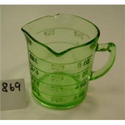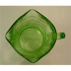Kellogg's green glass measuring cup with 3 spouts. Kellogg's script logo embossed in the base. 3.5" tall and 3.5" wide. Condition: 1/2" chip by one spout, otherwise good.