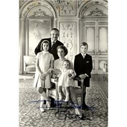 <b>1337. GRACE KELLY </b>(1929 - 1982) Beautiful American actress who gave up her film career to marry Prince Rainier of Monaco in 1956. Fine vintage S.P. 4" x 6" b/w, showing Grace with <b>PRINCE RANIER</b>, who also signs, and their children in a lavish palace setting. Boldly signed at bottom. With the original transmittal envelope, near fine condition.<b> $200-300</b>