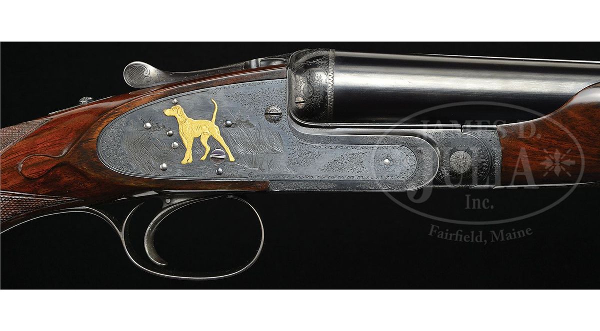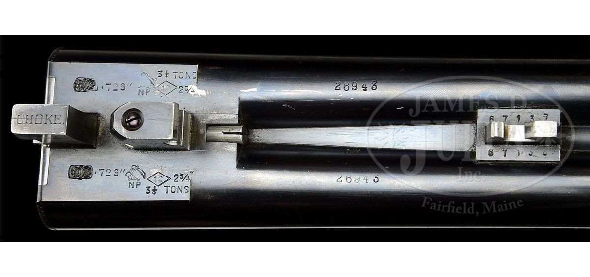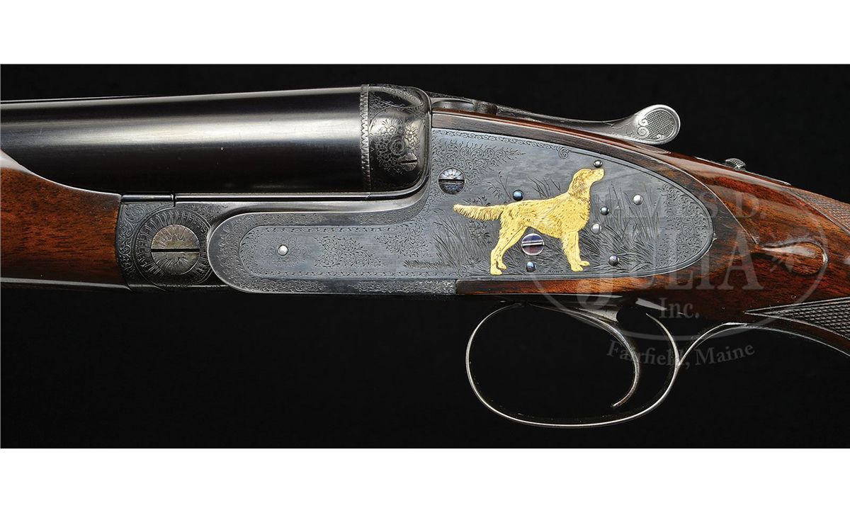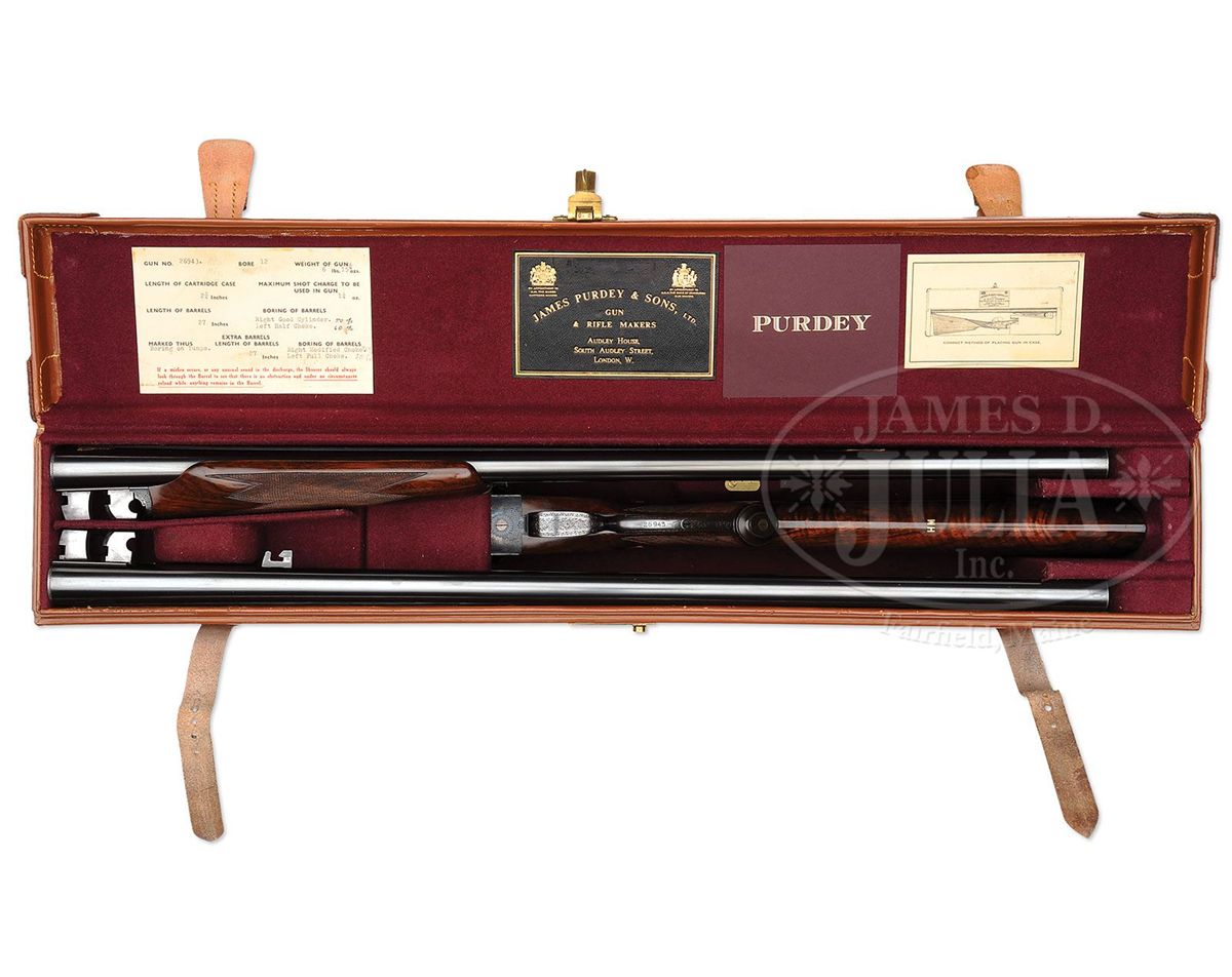 SN 26943. (1961) Cal. 12 ga. 2-3/4" Chambers. Two sets of 27" chopper lump bbls, one with IC and Mod, and the other with Mod and Full chokes. Full choked bbls are marked "Choke" on rear lump, and with gold star on rib. Both sets have raised, matted, narrow, flat ribs, and are engraved "J. Purdey & Sons." and "Audley House. South Audley Street. London." on tops. Bbl flats are stamped with London nitro proofs for 2-3/4" chambers. Bottoms of bbls are stamped with SNs, left bbl with bbl maker's initials "GW" (George Wood). Tube nos. "67135" and "67136" are on open choked bbls, and "67137" and "67138" on choked bbls. Blued Beesley patent, self-opening, sidelock action features non-automatic safety (SAFE inlaid in gold), bushed strikers, raised rib tumbler end cocking indicators, and Purdey non-selective single trigger. Action is engraved with small scroll and rose bouquets in Purdey "house" style. Bottom is engraved with "J. Purdey & Sons" "London" "England". Lockplates are engraved with similar scroll framing vignettes of gold inlaid dogs in field settings; a pointer on right lockplate, and a setter on left. These well detailed scenes are by noted master engraver, Ken Hunt, whose signature appears at the bottom of each scene. Small bow trigger guard has tang, which extends to grip cap, is scroll engraved, and has SN at grip. Boldly figured and well marbled European walnut full capped pistol grip buttstock measures 14-1/4" over checkered wood butt, and features drop points, as well as point pattern checkering with mullered borders. Individual initials "H" and "M" (Hal McCoy, well known Baseball Hall of Fame long time Sports Writer to the Cincinnati Reds) are on toe line. Also included is a custom made matching stock, fitted with "Hydro Coil" recoil reducing butt section, ebony grip cap of which has central gold oval engraved "HM". Matching large beavertail forend with Anson release is stamped with actioners initials "B.D" (Ben Delay) on iron. Open choke bbls: Bore diameter: left-.732, right -.733. Bore restrictions: left -.016 (Lt mod), right -.010 (IC). Wall thickness: left -.040, right -.038. Drop at heel: 2-1/8", drop at comb: 1-3/8". Weight: 7 lbs. 9 oz. LOP: 14-1/4". Heavily choked bbls: Bore diameter: left-.733, right -.731. Bore restrictions: left -.038 (Full), right -.017 (Mod). Wall thickness: left -.039, right -.038. Drop at heel: 2-1/8", drop at comb: 1-3/8". Weight: 7 lbs. 0 oz. LOP: 14-1/4". Maker's motor case with stitched leather corners and single spring latch, with space for both sets of bbls and gun, is embossed "HM" in gold. Case is lined in burgundy cloth, and has makers gold embossed black leather label in lid, along with charge card, and information about bbls and chokes. Case contains 2-pc ebony and brass cleaning rod marked "M. Marsh England". PROVENANCE: Internet information on Hal McCoy and Ken Hunt. CONDITION: Excellent, as partially refinished. Bbls retain 95 - 98% orig blue with some minor nicks and marks, silvered at muzzles. Action blued, and retains nearly all of that blue. Trigger guard re-blued and retains most of that blue, engraving slightly softened. Orig blue of thumbpiece and hinge pin is mostly silver. Stocks retain nearly all of a gloss finish with only a few minor marks. Bores are excellent, smooth, bright and shiny throughout. Action is tight. Bbls are on face. Ejectors and trigger work perfectly. Case leather is still light in color with some discoloration, bumps and rubs. Straps and handle are fine. Leather is beginning to crack on straps. Interior cloth is excellent. Charge card is darkening. Leather label has some rubs. A good looking, fine handling gun for any application. 4-48303 MGM39