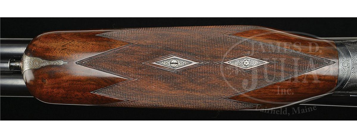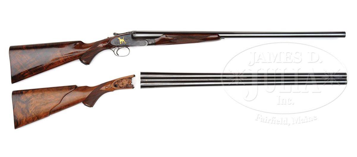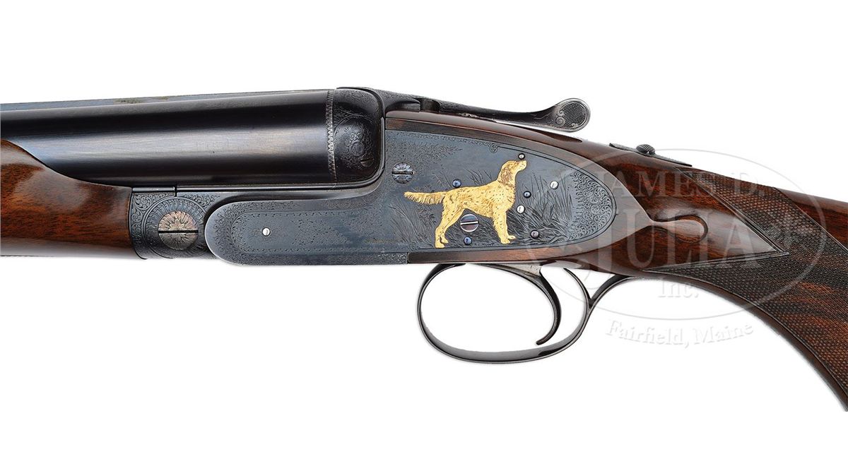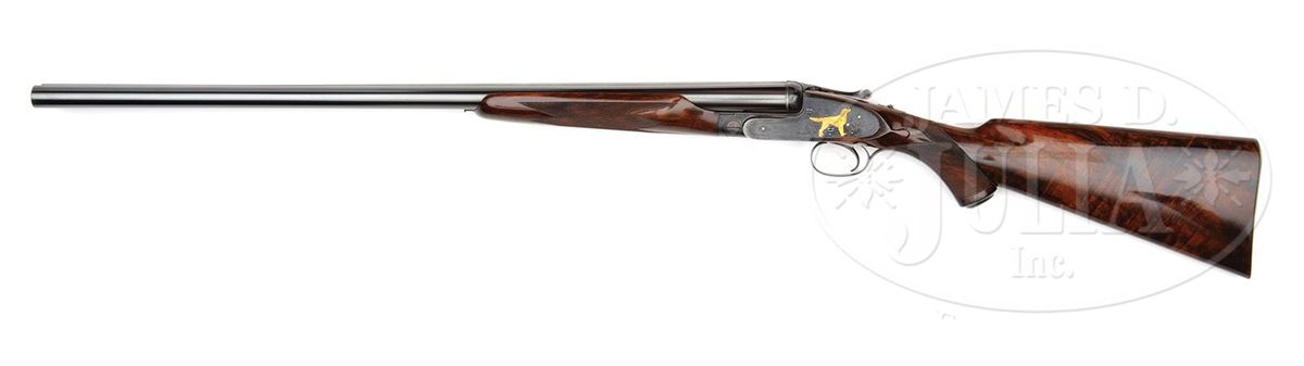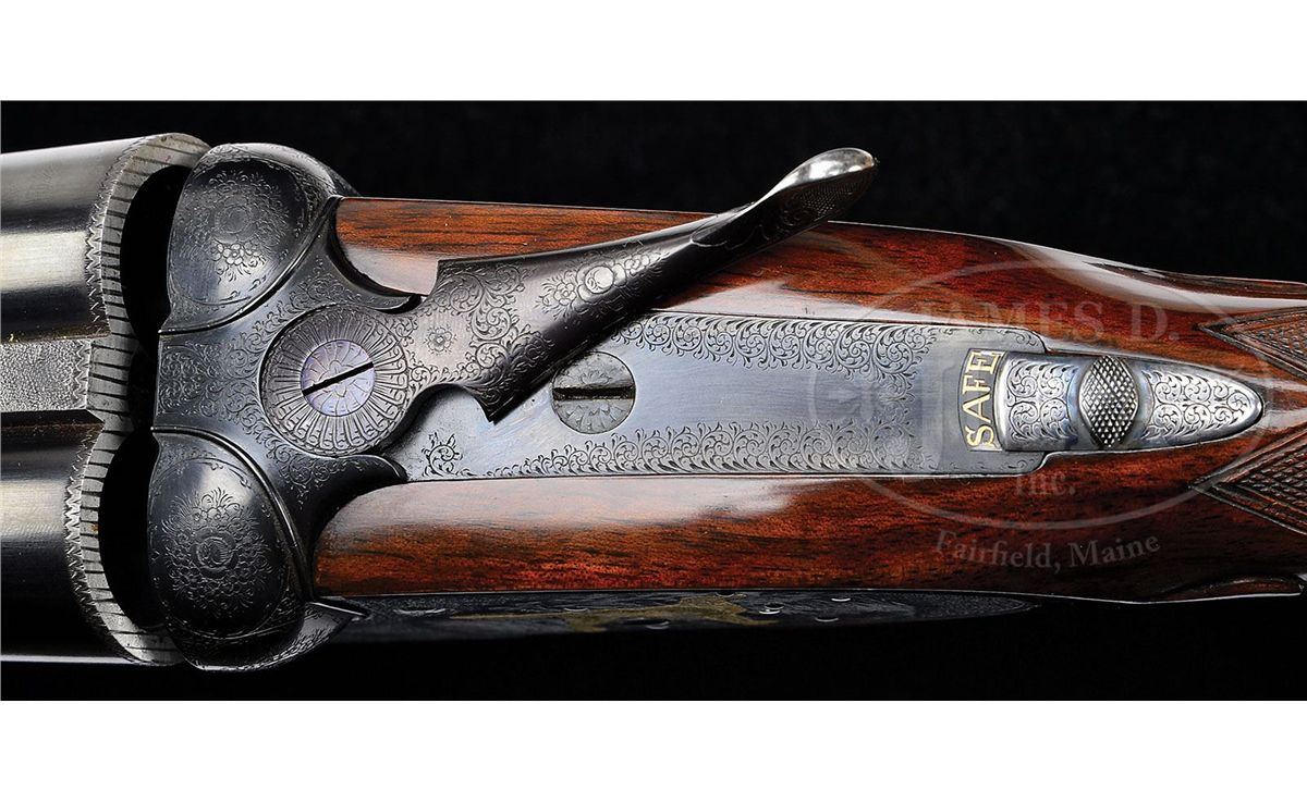 SN 26943. (1961) Cal. 12 ga. 2-3/4" Chambers. Two sets of 27" chopper lump bbls, one with IC and Mod, and the other with Mod and Full chokes. Full choked bbls are marked "Choke" on rear lump, and with gold star on rib. Both sets have raised, matted, narrow, flat ribs, and are engraved "J. Purdey & Sons." and "Audley House. South Audley Street. London." on tops. Bbl flats are stamped with London nitro proofs for 2-3/4" chambers. Bottoms of bbls are stamped with SNs, left bbl with bbl maker's initials "GW" (George Wood). Tube nos. "67135" and "67136" are on open choked bbls, and "67137" and "67138" on choked bbls. Blued Beesley patent, self-opening, sidelock action features non-automatic safety (SAFE inlaid in gold), bushed strikers, raised rib tumbler end cocking indicators, and Purdey non-selective single trigger. Action is engraved with small scroll and rose bouquets in Purdey "house" style. Bottom is engraved with "J. Purdey & Sons" "London" "England". Lockplates are engraved with similar scroll framing vignettes of gold inlaid dogs in field settings; a pointer on right lockplate, and a setter on left. These well detailed scenes are by noted master engraver, Ken Hunt, whose signature appears at the bottom of each scene. Small bow trigger guard has tang, which extends to grip cap, is scroll engraved, and has SN at grip. Boldly figured and well marbled European walnut full capped pistol grip buttstock measures 14-1/4" over checkered wood butt, and features drop points, as well as point pattern checkering with mullered borders. Individual initials "H" and "M" (Hal McCoy, well known Baseball Hall of Fame long time Sports Writer to the Cincinnati Reds) are on toe line. Also included is a custom made matching stock, fitted with "Hydro Coil" recoil reducing butt section, ebony grip cap of which has central gold oval engraved "HM". Matching large beavertail forend with Anson release is stamped with actioners initials "B.D" (Ben Delay) on iron. Open choke bbls: Bore diameter: left-.732, right -.733. Bore restrictions: left -.016 (Lt mod), right -.010 (IC). Wall thickness: left -.040, right -.038. Drop at heel: 2-1/8", drop at comb: 1-3/8". Weight: 7 lbs. 9 oz. LOP: 14-1/4". Heavily choked bbls: Bore diameter: left-.733, right -.731. Bore restrictions: left -.038 (Full), right -.017 (Mod). Wall thickness: left -.039, right -.038. Drop at heel: 2-1/8", drop at comb: 1-3/8". Weight: 7 lbs. 0 oz. LOP: 14-1/4". Maker's motor case with stitched leather corners and single spring latch, with space for both sets of bbls and gun, is embossed "HM" in gold. Case is lined in burgundy cloth, and has makers gold embossed black leather label in lid, along with charge card, and information about bbls and chokes. Case contains 2-pc ebony and brass cleaning rod marked "M. Marsh England". PROVENANCE: Internet information on Hal McCoy and Ken Hunt. CONDITION: Excellent, as partially refinished. Bbls retain 95 - 98% orig blue with some minor nicks and marks, silvered at muzzles. Action blued, and retains nearly all of that blue. Trigger guard re-blued and retains most of that blue, engraving slightly softened. Orig blue of thumbpiece and hinge pin is mostly silver. Stocks retain nearly all of a gloss finish with only a few minor marks. Bores are excellent, smooth, bright and shiny throughout. Action is tight. Bbls are on face. Ejectors and trigger work perfectly. Case leather is still light in color with some discoloration, bumps and rubs. Straps and handle are fine. Leather is beginning to crack on straps. Interior cloth is excellent. Charge card is darkening. Leather label has some rubs. A good looking, fine handling gun for any application. 4-48303 MGM39