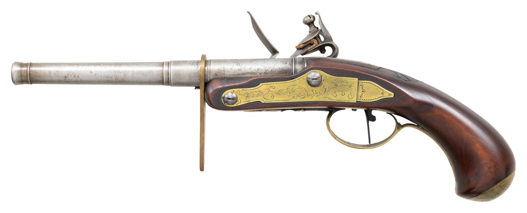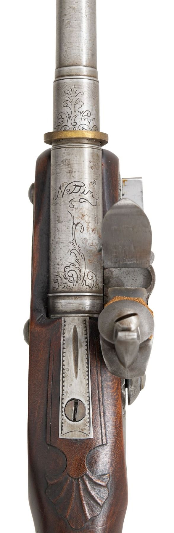 PISTOL. Cal. 45. NSN. Cannonade 8.25" barrel w/ light scroll engraving & "Netting" engraved near lock. Walnut stock w/ carved clam shell behind barrel tang & light floral engraving on brass furniture. UNATTACHED ACCESSORIES: brass gauge. CONDITION: barrel & lock have antique gray finish with peppery patina. Very good wood finish. Brass is starting to acquire patina. Good rifling. Mechanically fine. (01-27986/MD). ANTIQUE. $600-900.