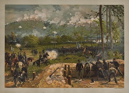 Fine 1887 L. Prang & Co., Boston chromolithograph depicting The battle of Kenesaw Mountain", 23 1/2" x 17", bearing two nominal 1/2" tears in margins, a few very scattered tiny brown spots which are virtually invisible, else very good.