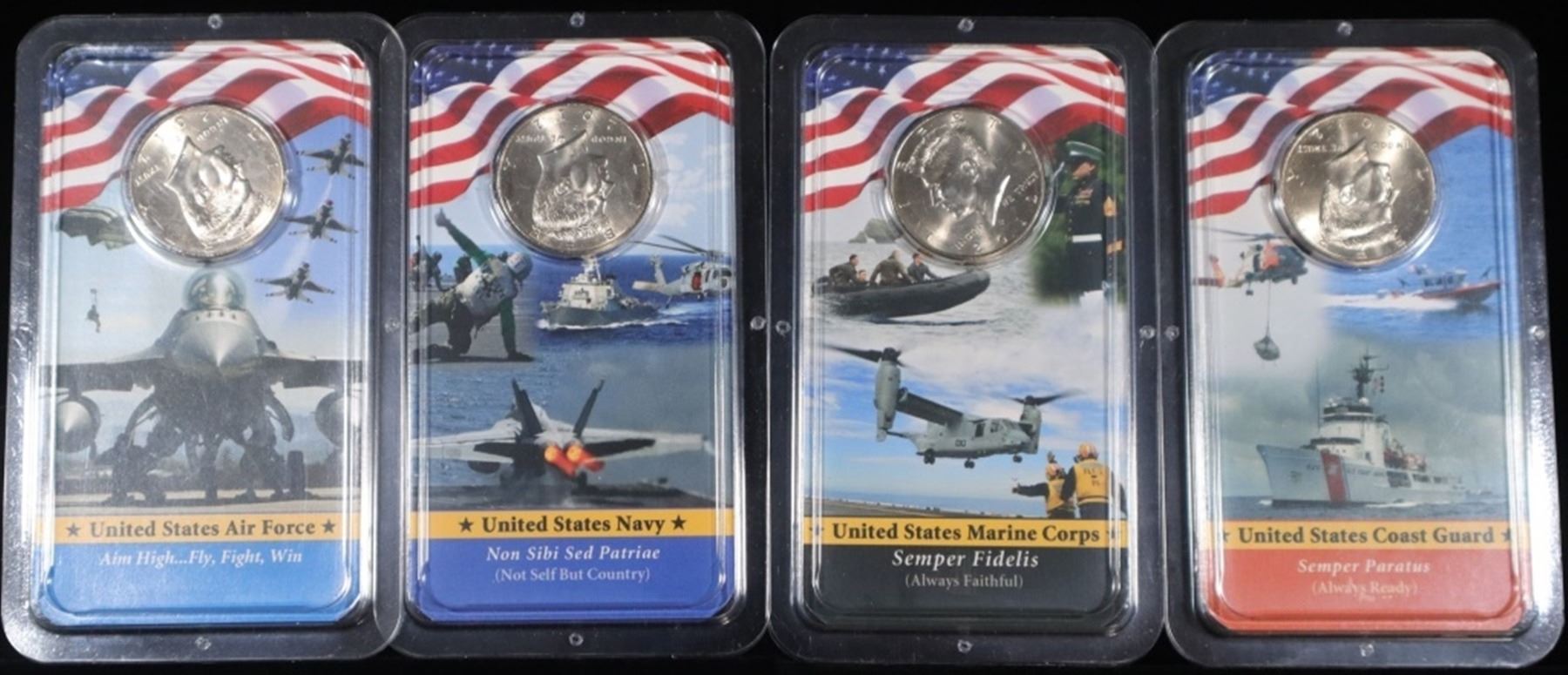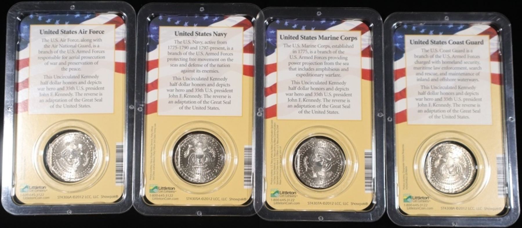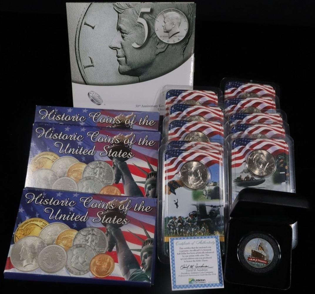 2014 50TH ANNIVERSARY KENNEDY HALF DOLLAR UNC 2-COIN SET, 2012 COLORIZED TITANIC KENNEDY HALF, (11)MISC ARMED FORCES LITTLETON INFORMATIONAL PACKAGING (ARMY, NAVY, COAST GUARD, AIR FORCE), (3) HISTORIC COINS OF THE