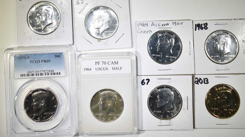 1964-68, 2013 GOLD PLATED, 1964 USCGS PERFECT  GEM PROOF & 1971-S PCGS PR-69.   ESTIMATE  $125 - $150.