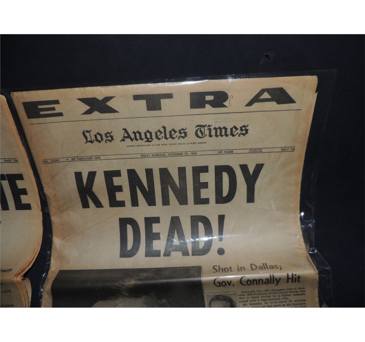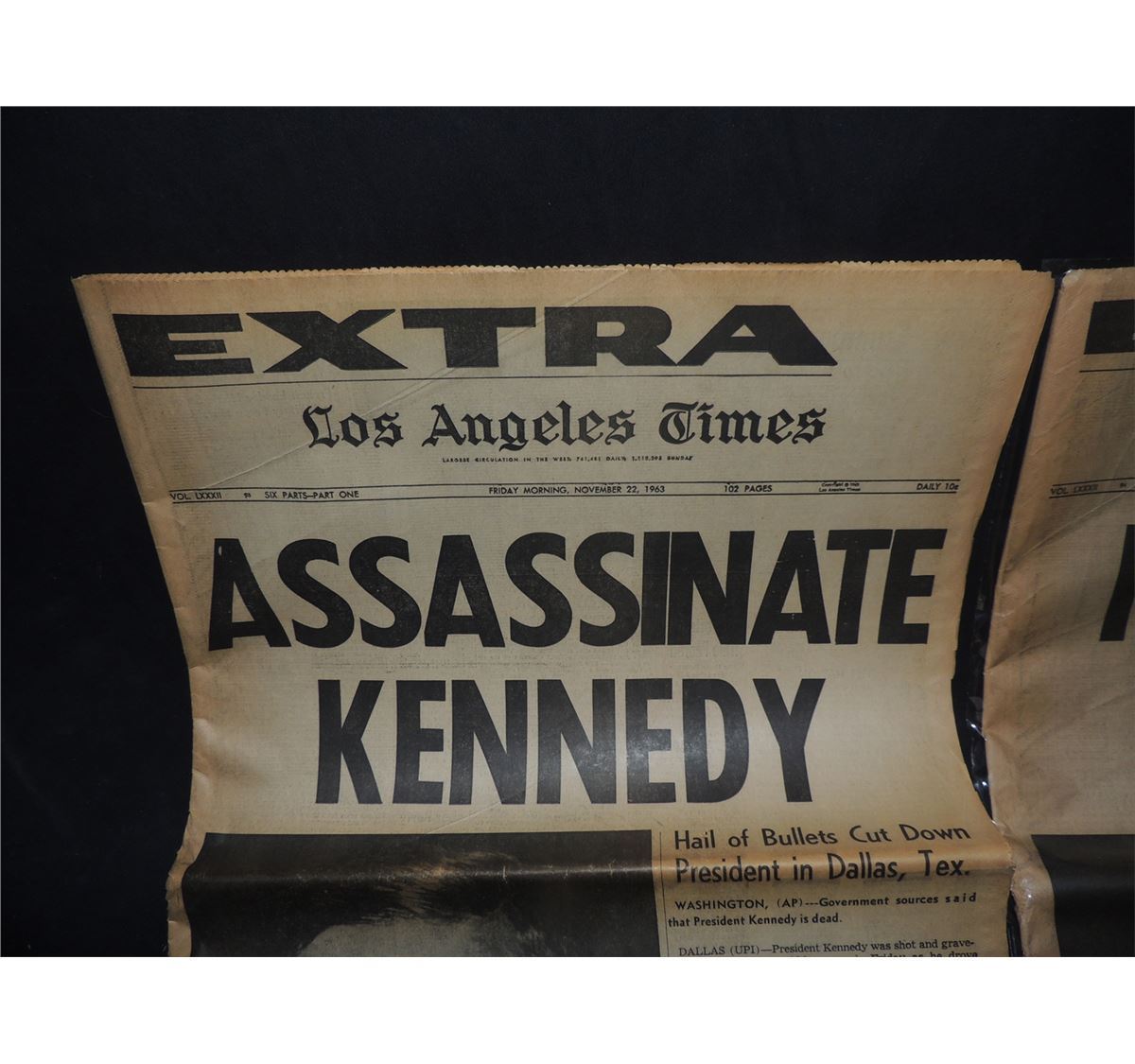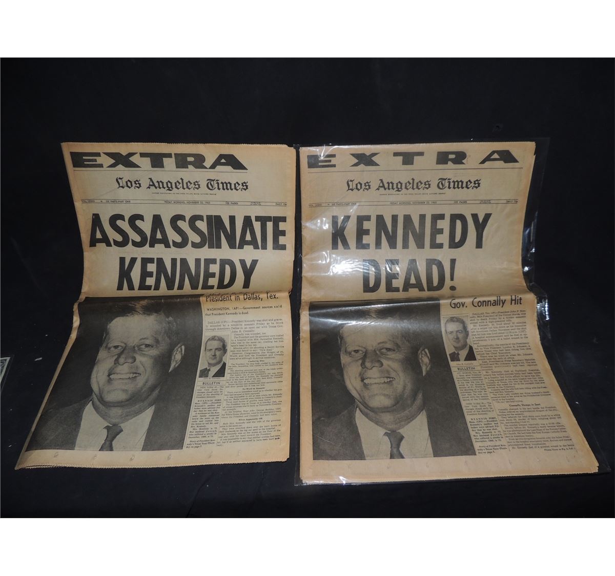 These are 2 different versions of the same exact LA TIMES EXTRA newspaper dated November 22nd, 1963. The day President John F. Kennedy was assassinated. They are the same volume and the same exact paper in every way except the headlines.