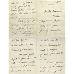 <b>141. JOHN F. KENNEDY</b> Good content A.L.S. on Hyannisport letterhead, 4pp. 8vo., Sep. 3 [n.y., but most likely 1940] to a Mr. Goldsmith, one of Kennedy's neighbors at Hyannisport. In full: "<i>Dear Mr. Goldsmith: Thanks very much for your letter and your friendly comment on the book - also the radio transcription which I imagine you had a good deal to do with. I sent you over a copy about a week ago which means you will now have two to content with. I'm sorry it didn't get there sooner. You were quite right on your comment on the words at the conclusion. I felt at the time, that the most effective way was to merely point out the various factors - and let people then make up their minds. Thank you again for writing - I appreciate it an awful lot. I hope I see you when I get up. Warmest regards, Jack</i>". One fold, staple hole at blank upper-left, else very good. Kennedy no doubt is making reference to his book <i>Why England Slept</i>, written by Kennedy in 1940 when he was still in college and reprinted in 1961 when he was president, this book is an appraisal of the tragic events of the thirties that led to World War II, an account of England's lack of preparedness for war and a study of the shortcomings of democracy when confronted by totalitarianism.<b>$2,000-3,000</b>