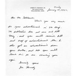 <b>145. JOSEPH P.KENNEDY JR. </b>(d. 1944) Eldest son of Joseph P. Kennedy, and brother of John F. Killed in action over Suffolk England during World War II. Excessively rare A.L.S. on his letterhead, 1p. 8vo., Wallingford, Ct., Jan. 15, 1932. From Choate School, Kennedy writes a Mr. Goldsmith, in full: "<i>Dear Mr. Goldsmith: Thank you very much for your advertisement in the Brief. The publication does not come out till May, and you will receive [a] bill and proof of advertisement then. I also got an advertisement from your brother, and hope you will thank him for me. Thanking you again. Sincerely Yours Joe Kennedy</i>". Both Joe and his younger brother, future President John Kennedy, served as managers for the school's newspaper. Arthur Goldsmith was a close friend and business associate of Joseph Kennedy, Sr. Fine condition.<b>$2,500-3,500</b>