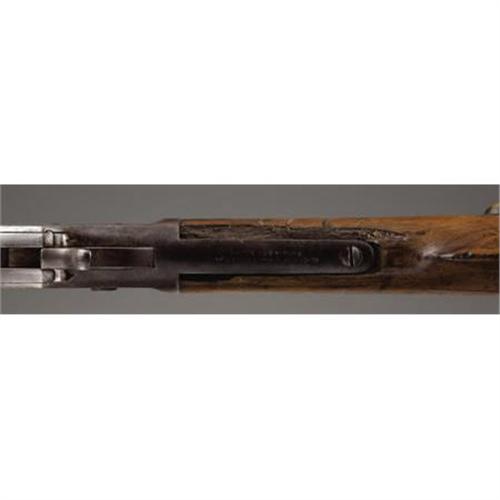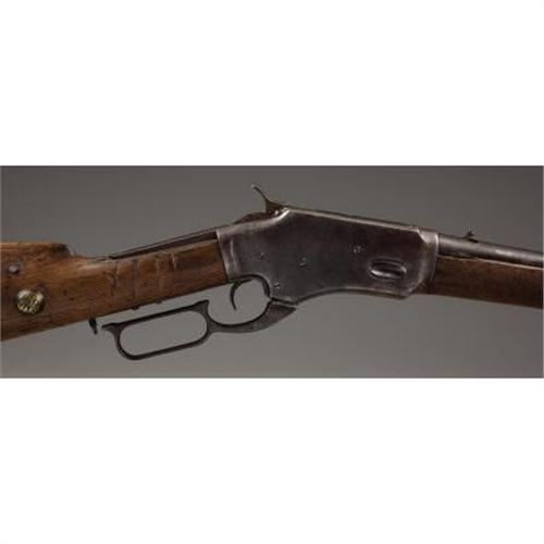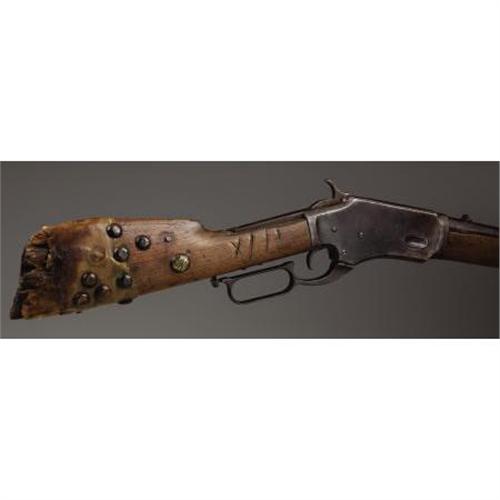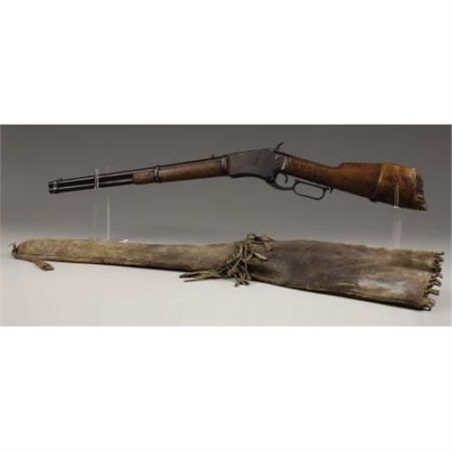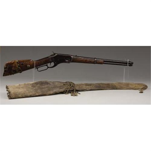 <B>KENNEDY SADDLE RING CARBINE</B></I> - Serial number "I 127" Circa 1880's. .44-.40 caliber with 20" round barrel stamped "Whitneyville Armory, CT, U.S.A." This carbine sat in a moist environment, causing the butt of the stock to erode and the butt plate to become detached. A very old and hard rawhide wrap, along with a number of large-diameter tacks are present on the butt stock. There are a number of markings in the wood applied to add decoration. This carbine is a rare survivor of the Indian wars era. Accompanied by an Indian-made scabbard with fringe decoration. <BR><B><BR>Condition:</B></I> Saddle ring intentionally removed during period of use, as found on many American Indian carbines. Carbine has an overall un-cleaned pleasing appearance.<BR><BR><b>Shipping:</b> Bats, Clubs, Sticks, Swords, Rif (<a target="_blank" href="http://www.heritageauctions.com/common/shipping.php">view shipping information</a>)