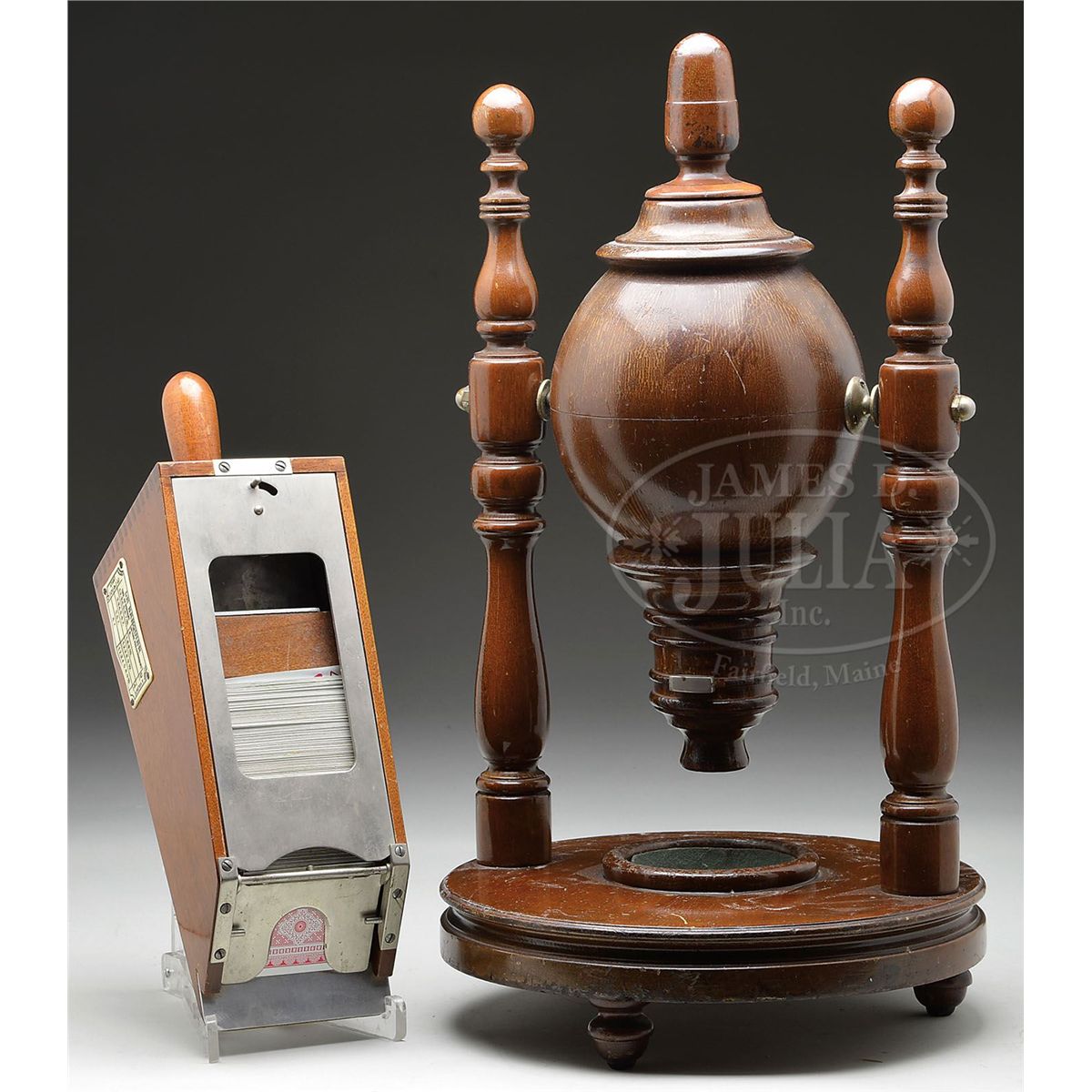 Gambling room go-withs, the lot includes a wooden keno goose consisting of two turn columns supporting an urn like vessel that holds numbered balls that are dispensed through the bottom. Lot also includes a wood and aluminum card shoe that would dispense cards for a table game dealer. SIZE: 22-1/2" h x and 15-1/2" l, respectively. CONDITION: Both are very good to near excellent with average wear. Keno goose has only a small selection of balls. 1-13178
