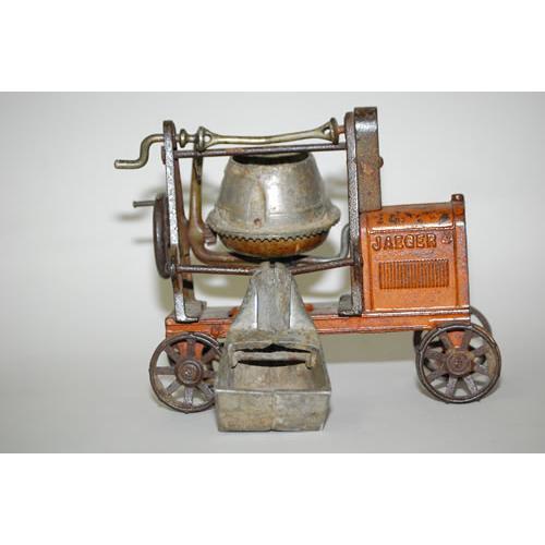 KENTON JAEGER CONCRETE MIXER - 8 1/2" KENTON SALMON/ ORANGE PAINTED CAST IRON JAEGER CONCRETE MIXER W/ SPOKE TRACTOR WHEELS - REPAIRED & REPLACED ARM TO BACK OF MIXER, CEMENT RESIDUE IN MIXER, PAINT LOSSES & WEAR