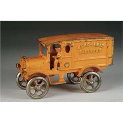 KENTON “MERCHANT’S DELIVERY” TRUCK. Charming early automotive toy, ca. 1910 featuring an early delivery vehicle with cast integral driver. Orange in color with gold highlighting and spoked nickel-plated cast iron wheels. SIZE: 6”. CONDITION: Overall very nice. JL 1-3885 (600-800)