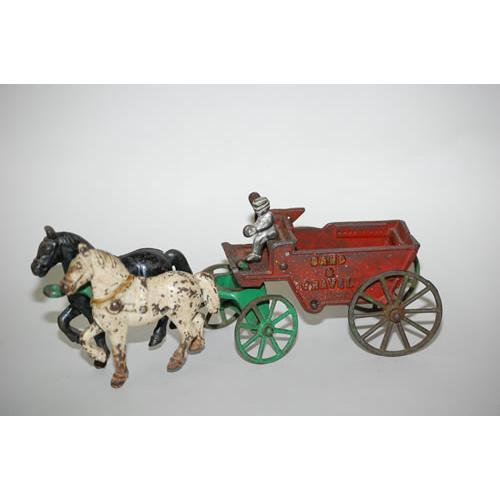 KENTON SAND & GRAVEL WAGON - 10" RED CAST IRON KENTON SAND & GRAVEL WAGON W/ GREEN SPOKE WHEELS, DOUBLE HORSES (1 WHITE & 1 BLACK) & DRIVER - MISSING CHAIN, PROBABLY REPLACEMENT DRIVER, LOSSES & WEAR, IMPERFECTIONS
