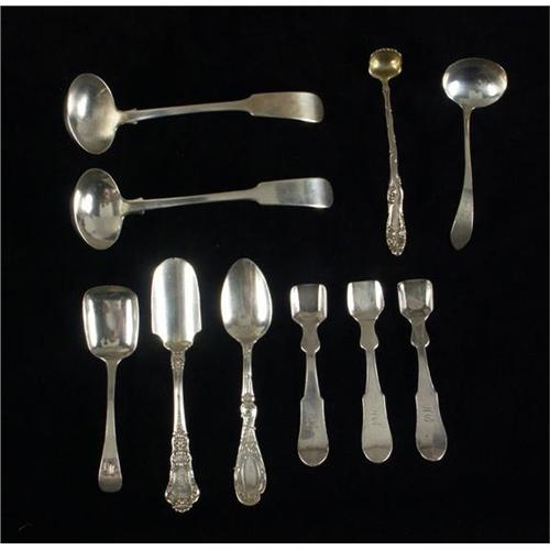 STERLING: Miscellaneous sterling flatware to include Gorham marrow scoop (?) with monogram in unascribed pattern; three coin silver sugar shovels by James Lemon of Louisville, KY (active 1828-1869) monogrammed 'MAB' (likely for Mildred Anne Fry Bullitt [1798-1879] mistress of Oxmoor plantation in Louisville); silver sugar shovel by Joseph Willmore of Birmingham England circa 1819 with 'h' monogram; Towle 'Old English' tiny ladle with gilt-wash bowl; Reed & Barton 'La Rocaille' teaspoon; pair coin silver ladles signed JS WICK; Whiting sterling ladle. All ex-collection of Harriet Stimson Bullitt.