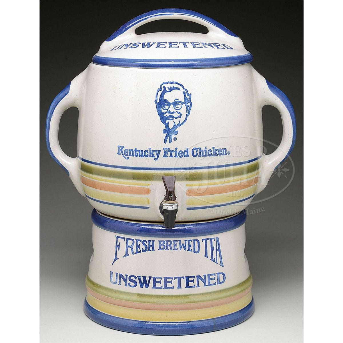 Three-piece in-store dispenser stenciled with the words "Kentucky Fried Chicken", the Colonel's face and has the word "Unsweetened" stenciled on the top. Manufactured by Louisville Stoneware of Kentucky. SIZE: 16" w x 20" t. CONDITION: Very good to excellent, has two tight hairlines to the bottom which are only visible inside the dispenser. 1-13424