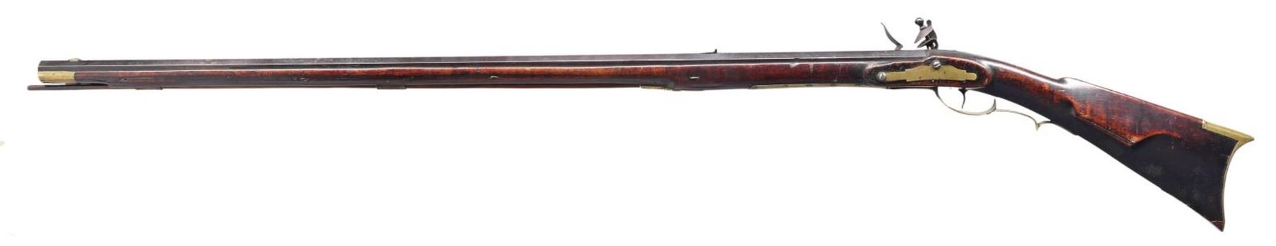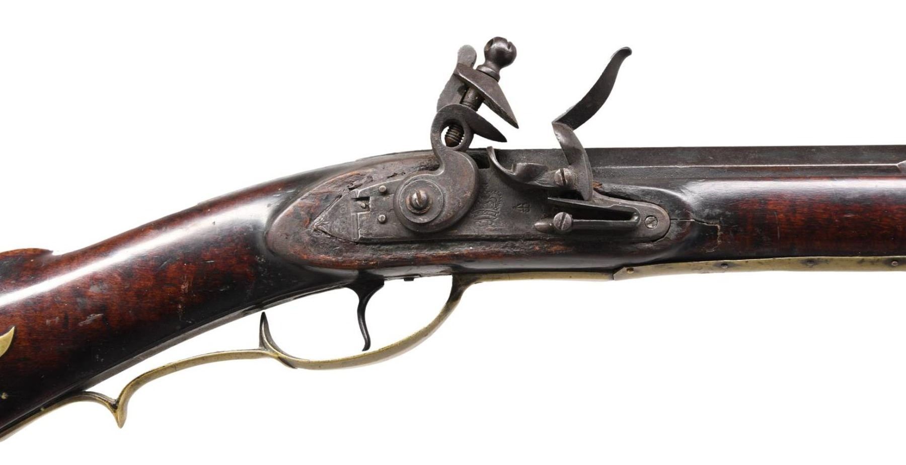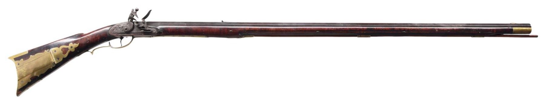Cal. 45. NSN. Bbl. 40 1/2" oct. rifled. Brass blade front sight. Small u-notch rear sight. Kentucky-style flintlock rifle built with a British lock. Lock has British crown "GR" and "TOWER" markings; there are no other visible markings. The lock is functional when hand-cycled. Hardwood stock with brass furniture. Finger-curl trigger guard, patchbox, and long brass repair ahead of the trigger guard. Replacement hardwood ramrod is secured by a brass thimble and two pipes. CONDITION: stock has added varnish with some cracks and epoxy repairs around the lock. Stock otherwise shows further repaired cracks, scattered dings, and handling wear. Brass parts are turning to a dull yellow mustard patina with oxidation and dings. Balance of the metal is a dark gray patina with varnish overruns, scattered oxidation, dings, and pitting. Bore shows scattered pitting and oxidation but evident rifling. (01-24333/MJC). ANTIQUE. $800-1,200.