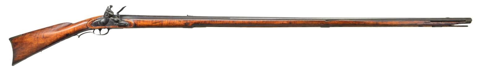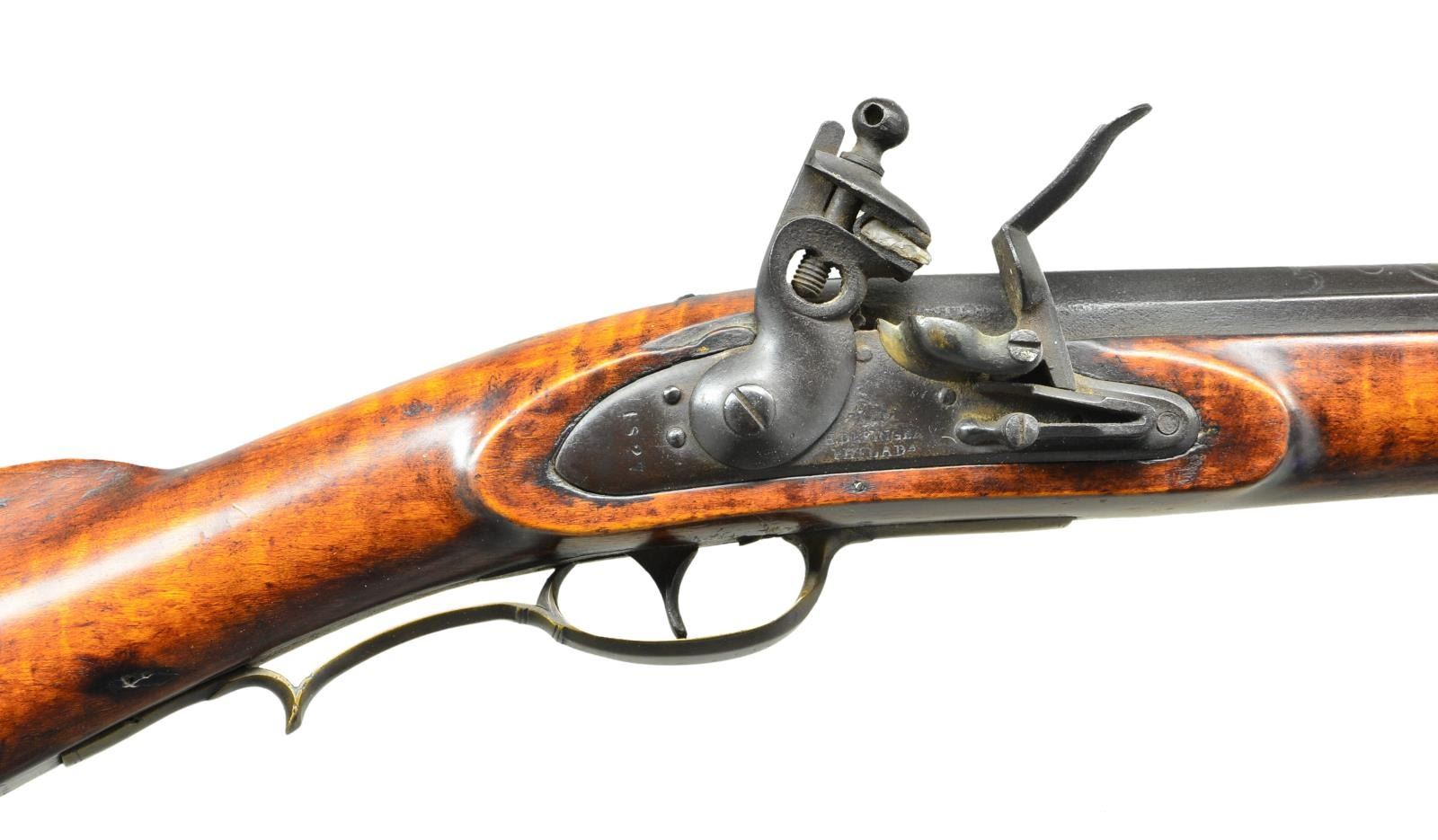 EUROPEAN BARREL & H. DERINGER LOCK. Cal. 65. NSN. This attractive American assembled fowler has 57 ¼” barrel with octagonal rear section, full length rib & with paneled transition from breech section to round in European fashion. Top of rear portion is relief engraved with scroll & has brass inlay. A single leaf U notch Kentucky type rear sight is installed in rear of rib. “H. DERINGER PHILADELPHIA” marked lock is dated “1827” on rounded tail & has reinforced cock inset brass pan, bridled friction frizzen & feather spring with bulbous finial. Full length stock with brass cap & Roman nose comb is made of rock maple with fairly good curly grain. Furniture is brass. Trigger has small spur forming grip. Crescent buttplate has 2” return. Hickory ramrod is held by 2 beaded pipes & matching thimble. CONDITION: good. Original flintlock. Barrel & lock retain a dark brown patina overall over some light pitting. Brass is nicely toned. Stock retains what appears to be most of its original finish with added oil. Over a fair number of marks & dings. Crack on left side panel through rear lock screw area & some cracks on right side of barrel channel with slivers of missing wood. Dark bore is fairly smooth. Lock is good. (01-21671/MGM). ANTIQUE. $2,250-3,500.