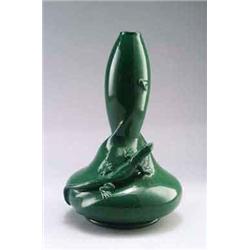 KERAMIKMANUFAKTUR PIERREFONDS, Pierrefonds Vase, Keramik. Heller Scherben mit dunkelgrüner Überlaufglasur, auf der Wandung vollplastisches Dekor einer Eidechse. Flaschenkürbisform, unterer Bereich stark gedrückt. H.: 31 cm. Bez.: Firmenmarke (Pressstempel). Um 1900