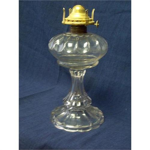 This is an older kerosene lamp. There is no chimney available for this piece. There are a number of bubbles in the glass and a mold imperfection mark in the base.