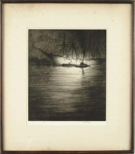 KERR EBY (American, 1889-1946) "NIGHT LOADING". Etching on paper of a large five-mast schooner with tug and other boat beside in a nighttime scene. Pencil signed. Frederick Keppel & Co label to reverse with title and artist, also "Proof printed by the artist. 90 proofs only". Housed in a simple wood frame with ivory matte. IMAGE SIZE: 9-3/4" x 8-1/4". CONDITION: Very good. 9-26800