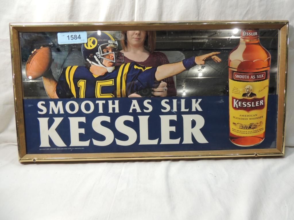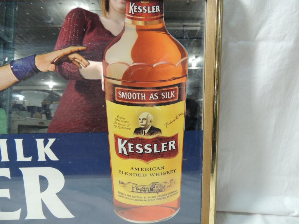 KESSLER SMOOTH AS SILK BLENDED WHISKEY VINTAGE MIRROR LIQUOR SIGN. FOOTBALL PLAYER SPORTS SIGN. AS SHOWN. SEE PHTOO FOR MORE DETAILS.