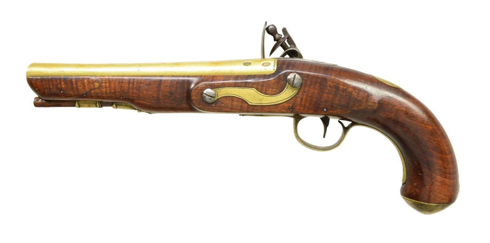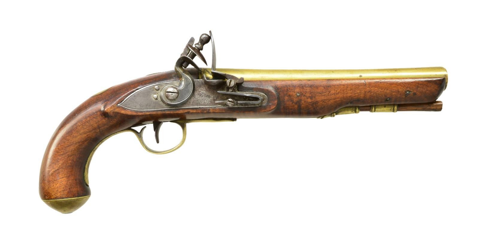 1800. 13 1/2" Overall. Bbl. 8" tapered flared rnd. brass marked “LONDON” & London proofs. Brass mounted, sparce engraving. Lock is marked “W. KETLAND & CO”, flat serpentine unsupported cock, unbridled frizzen. Striped walnut stock. CONDITION: very good overall, appears original & complete w/ braised repair to neck of cock. Well fit w/ hand worn patina to wood, brass cleaned w/ light mustard patina, iron has mottled gray patina. Mechanically fine w/ clear smooth bore. PROVENANCE: From the Collection of John "Tim" Breth Jr. (01-17778/JS). ANTIQUE. $700-900.