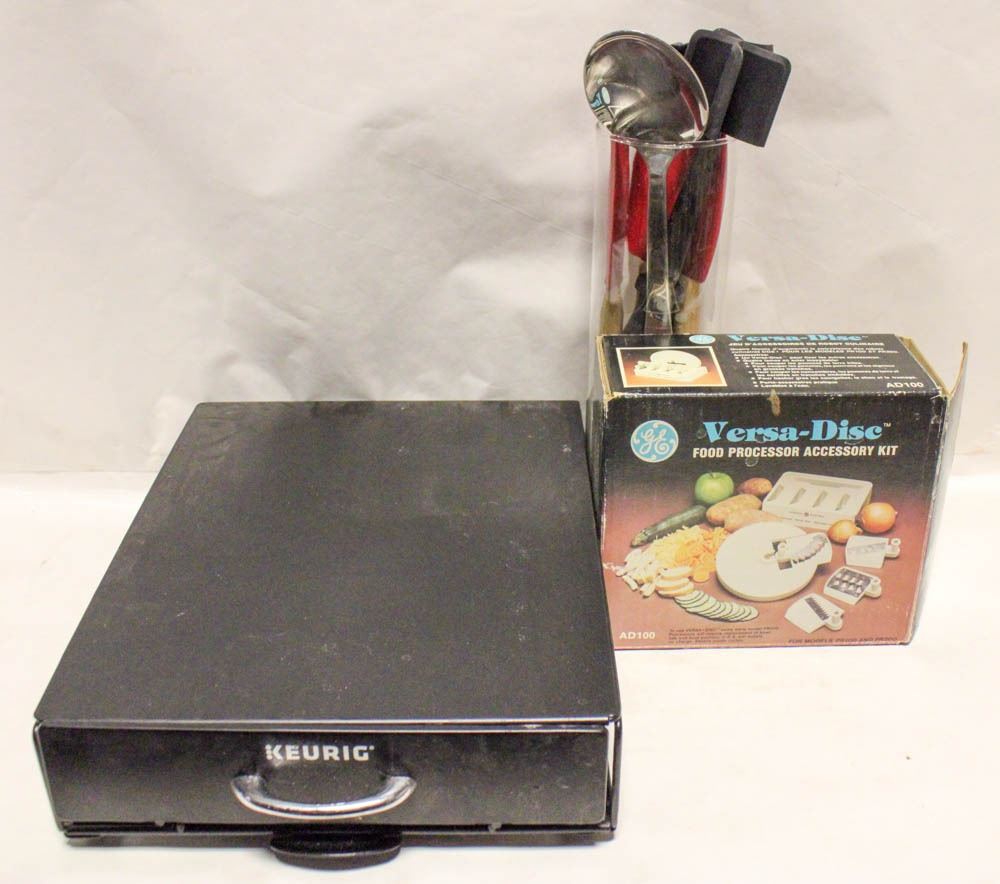 KEURIG K CUP RACK AND ASSORTED UTENSILS