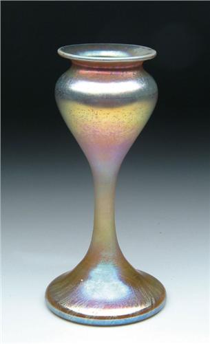 KEW BLAS FLOWER FORM VASE. Beautiful Kew Blas vase is finished in gold iridescence with wonderful flashes of red, purple and green. Foot of vase has lightly striped iridescence. Interior shows wonderful pink hues with rich blues and purple around lip. Signed in polished pontil "Kew Blas". SIZE: 8-1/4 in. t. CONDITION: Very good to excellent. 5-61173
