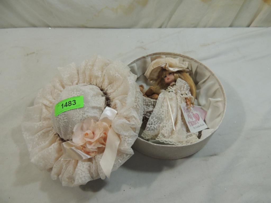 SMALL DOLL, COA, LINDA RICK, COLLECTIBLE DOLL, KEY TO MY HEART SERIES, KEEPSAKE BOX, DECORATIVE BOX, COLLECTIBLE BOX, STORAGE BOX, BOW ON BOX, DECORATIVE, HOME DECOR, AS SHOWN SEE PHOTO FOR MORE DETAILS.