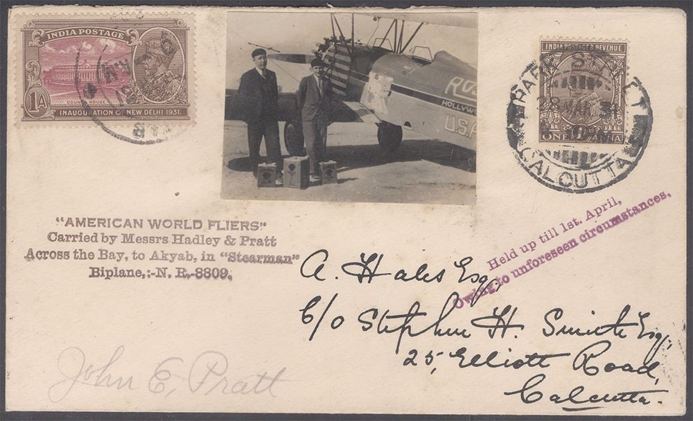 KGV, 1931,Air Mail, 1a,AMERICAN WORLD FLIERS flight byBiplaneCaried by Messrs Hadley Pratt Across the Bay to,AKYAB inStearmanBiplane theN. R. 8809, signed by pilotJohn PrattRoss Hadleyon front,Cancelled with PARK STREET CALCUTTA 28 Mar 31, Delivered at Calcutta on 5 APR 31.Violet pictorial cachet and instruction markHeld up till 1stApril, Owing to Unforeseen Circumstances, Good Condition, Very Rare