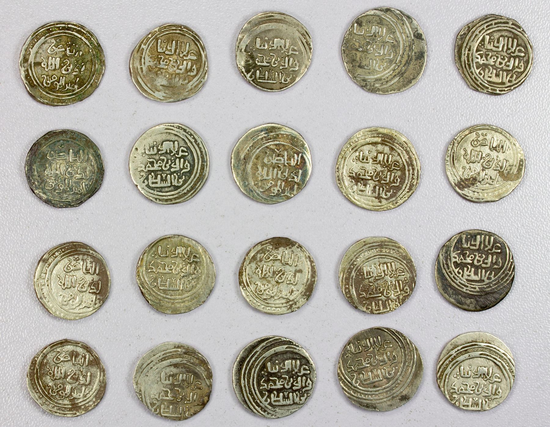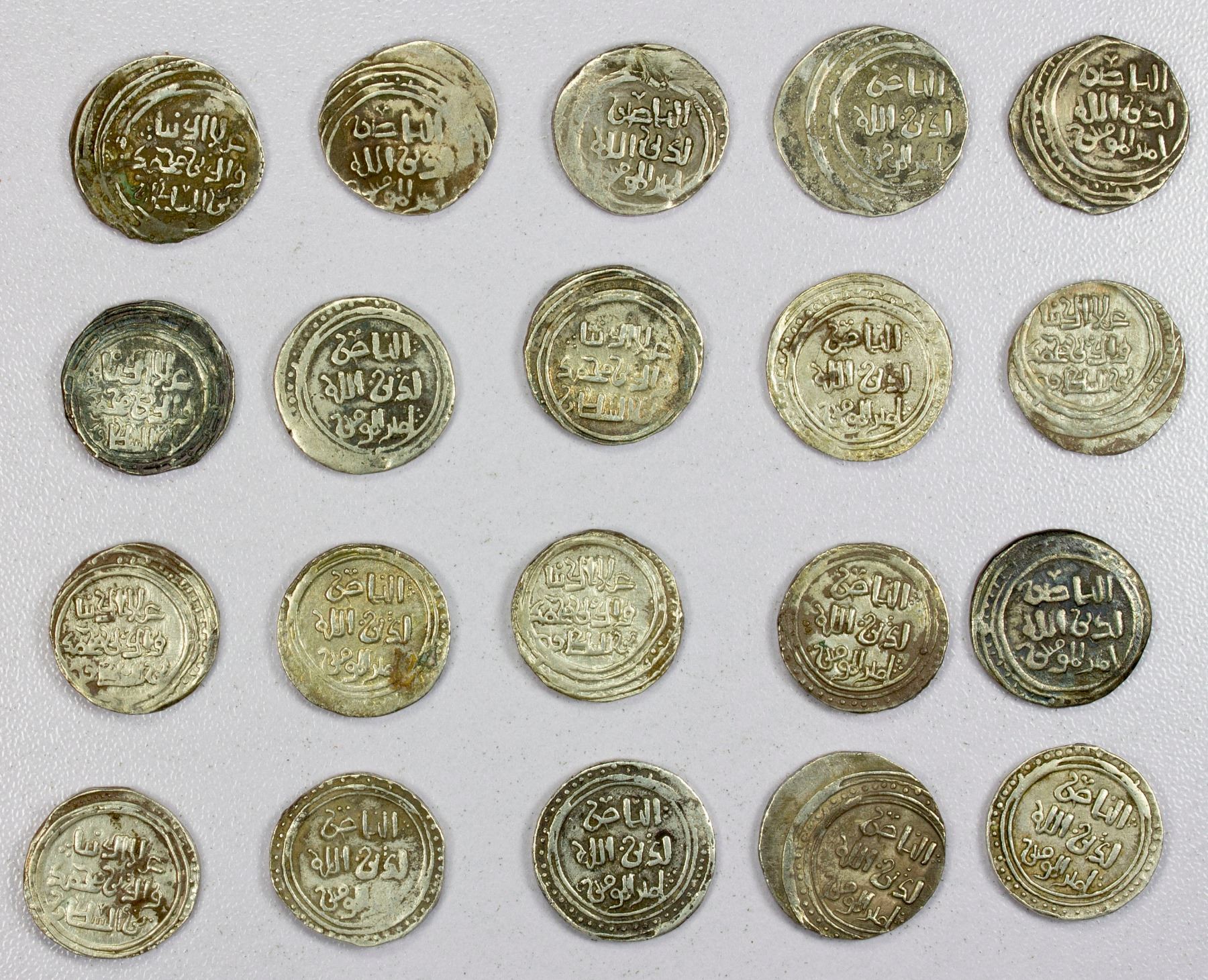 KHWARIZMSHAH: Muhammad, 1200-1220, LOT of 20 silver medium dirhams, type A-1721, without mint & date, but presumed struck only at Ghazna between AH615-617; prototype of the similar dirham in the name of Chingiz Khan (A-3701, formerly A-1967); average VF-EF condition, a few lesser, most with some discoloration; retail value $700, lot of 20 pieces.
