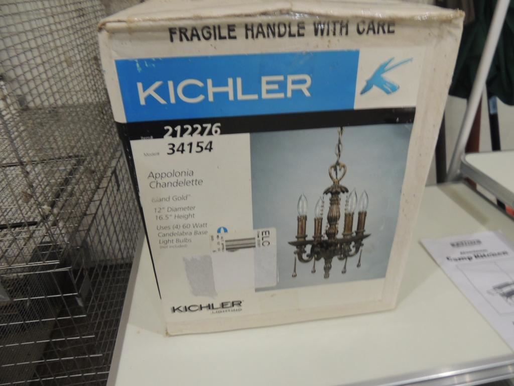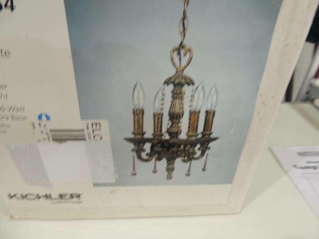 NEW IN BOX ISLAND GOLD LIGHT FIXTURE, DECORATIVE FIXTURE, CHANDELER, CHANDELETTE AS SHOWN SEE PHOTO FOR MORE DETAILS.