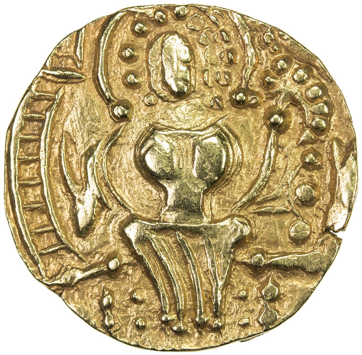 KIDARITE: Kidara, early 5th century, AV dinar (7.85g), Mitch-3695/3702var, standing king // Ardoksho enthroned, rare variety with no inscriptions other than the name kidara beneath the king's left arm, bold EF.