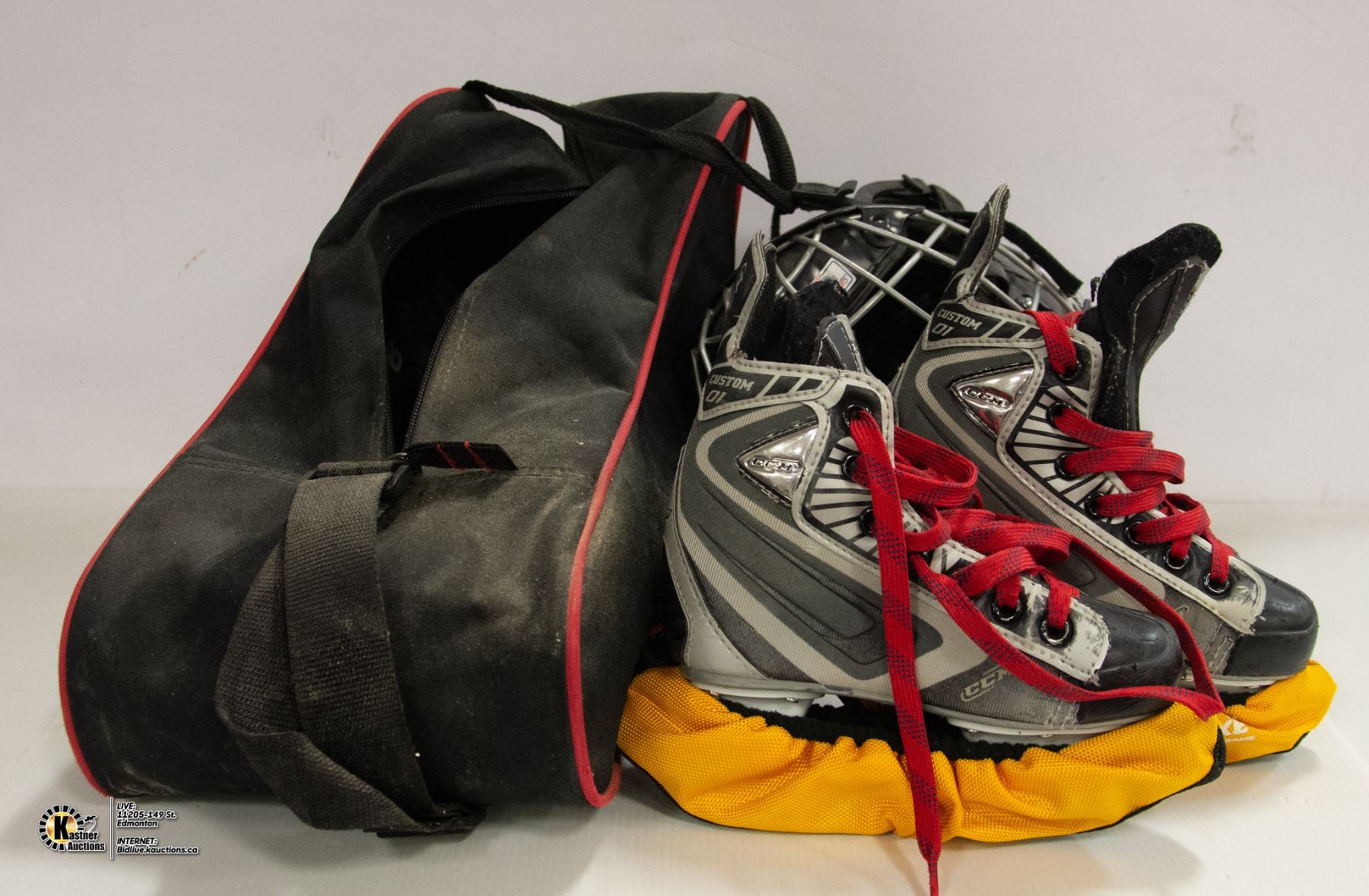 REEBOK HELMET WITH CAGE SIZE S, SHERWOOD GLOVES SIZE 8" 20CM, SKATES SIZE 12J, COMES WITH SKATE GUARDS AND SKATE BAG