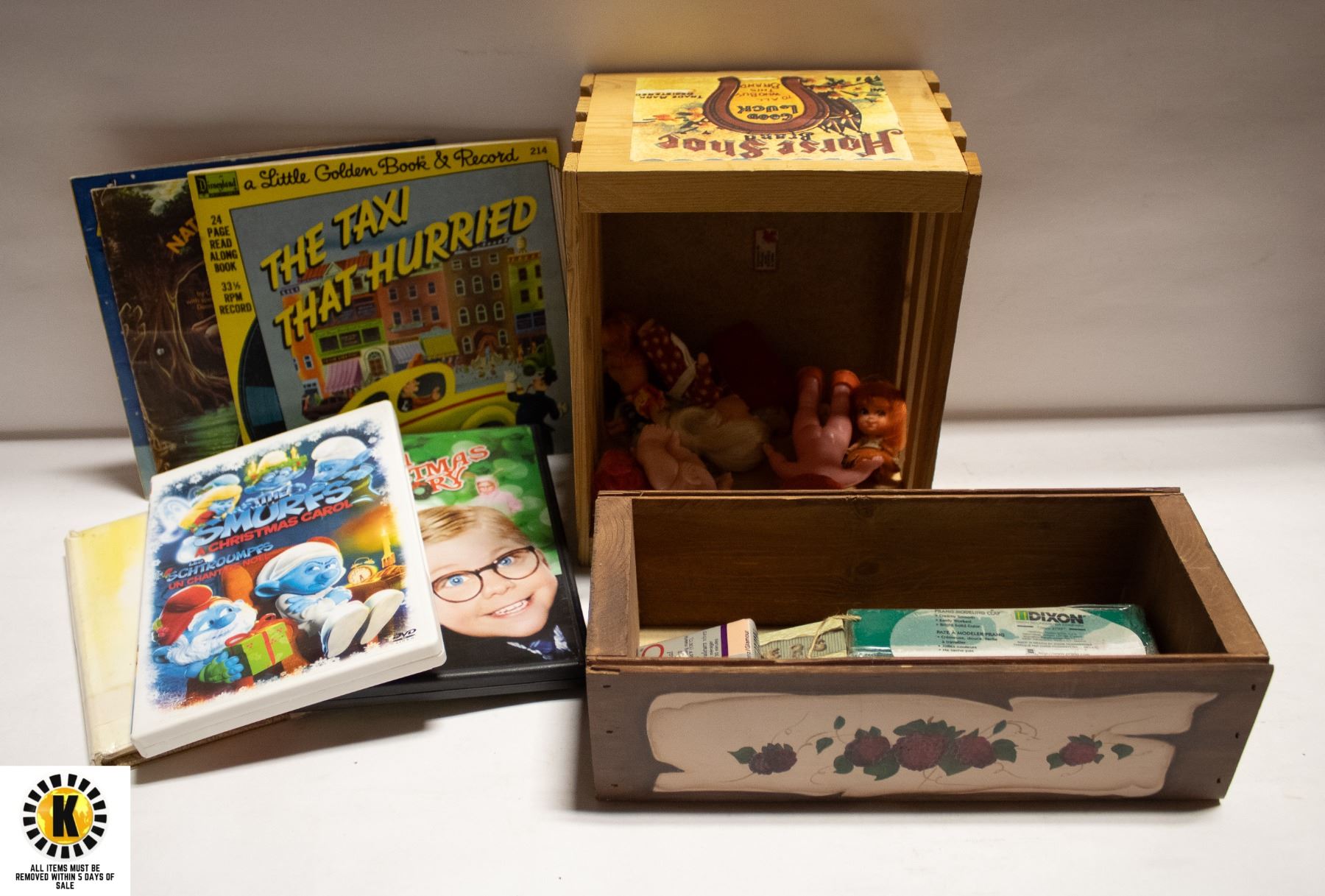 KIDS VINTAGE BOOKS, WOODEN CRATES, THUM THINGS