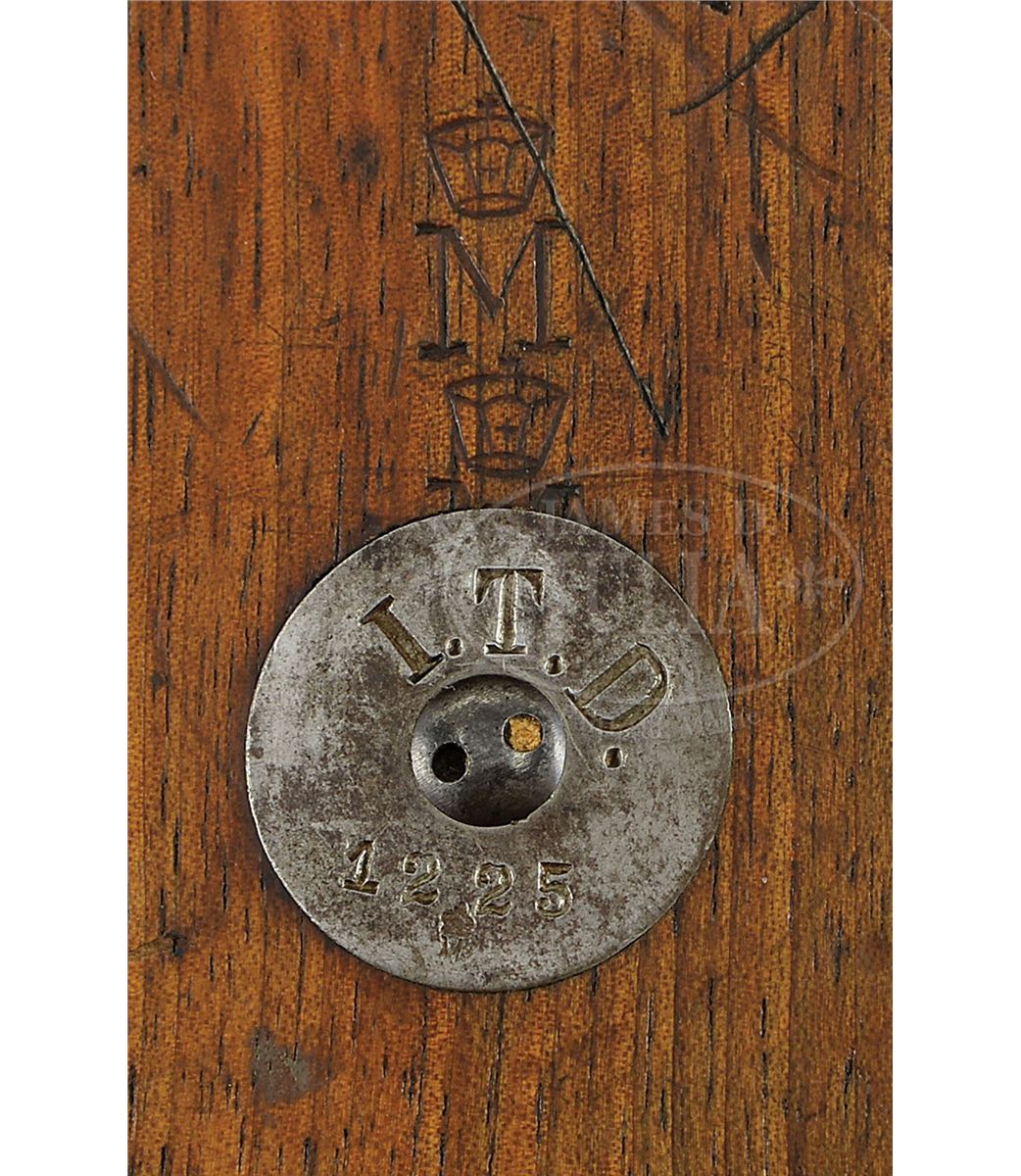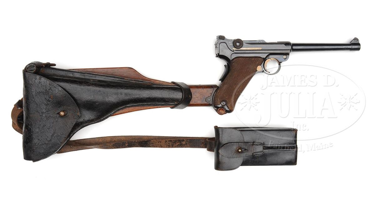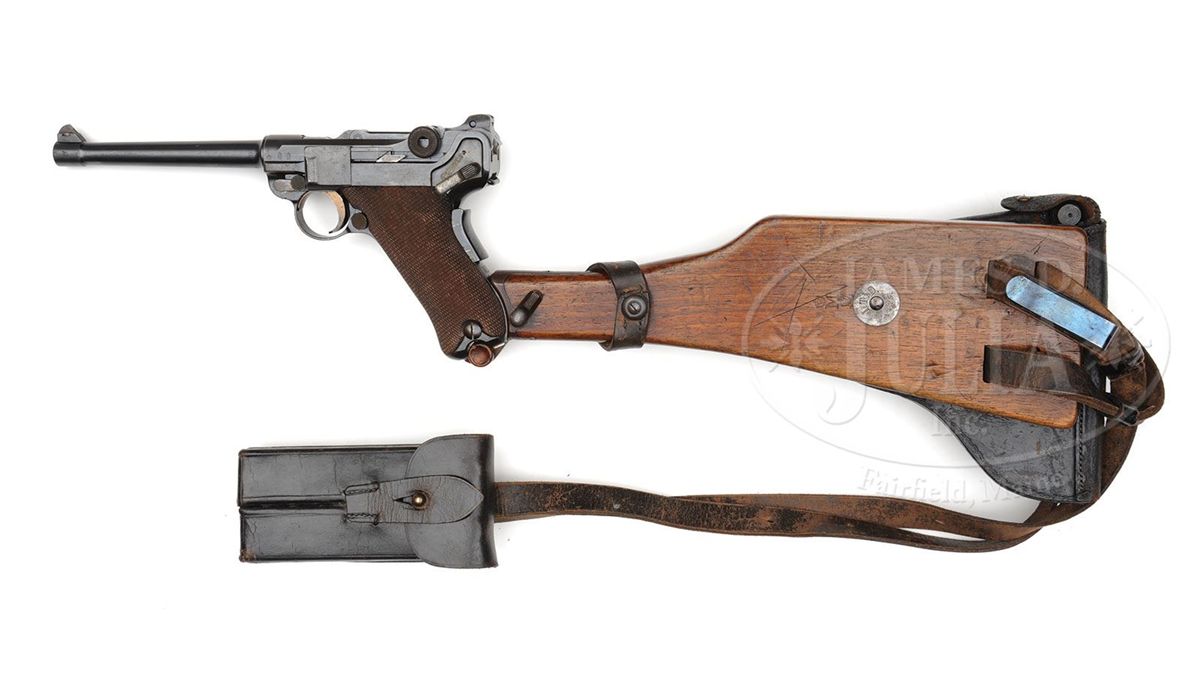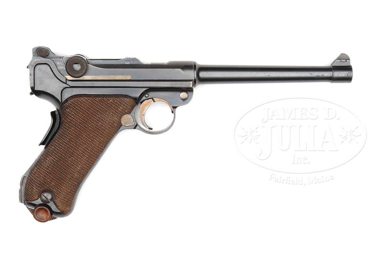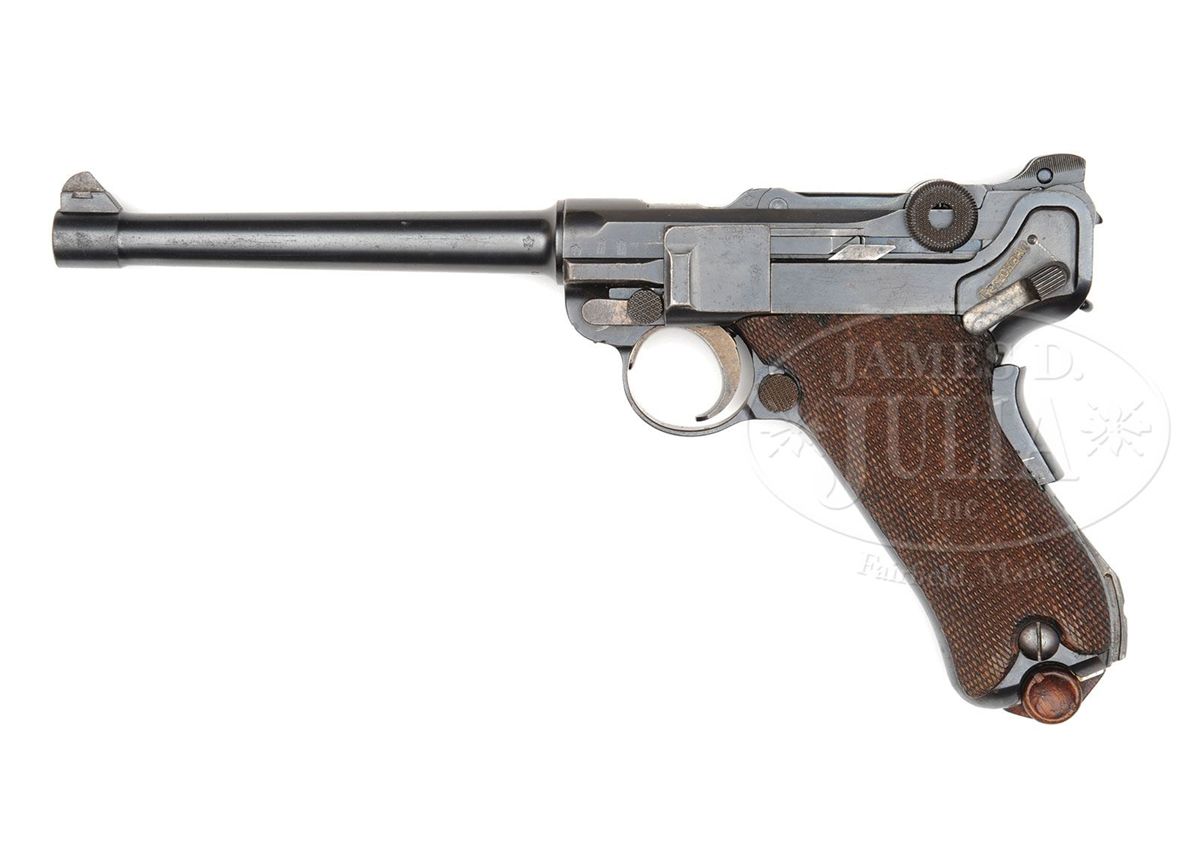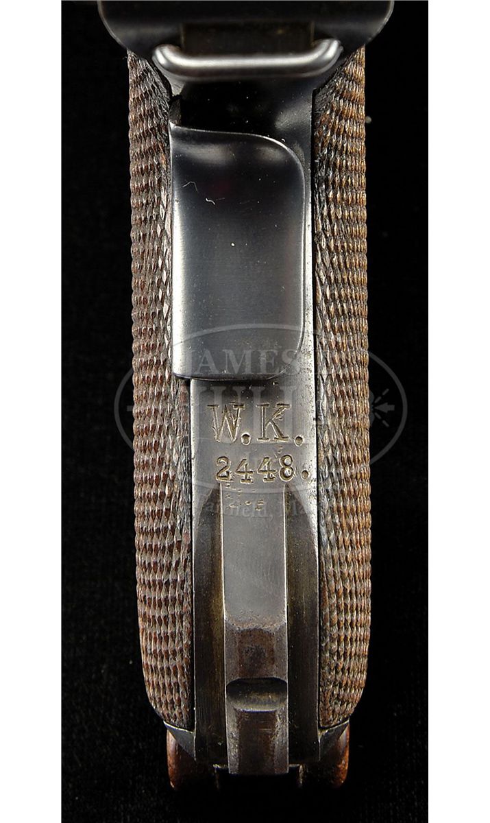 SN 7727. 6" 9mm bbl. "DWM" scroll on center toggle link. 100m/200m adjustable Navy rear sight. Crown/M proofs on left receiver. Grip safety. Safety position has been altered, and the original "Gesichert" has been removed from the bottom position and stamped into the upper position. Back gripstrap under grip safety has been unit marked "W.K./2448" (Kiel Dockyard, Weapon 2448). All numbered parts are matching down to the checkered walnut grips. This gun is featured on pp. 307, 638, 901, and 903 of Dr. Geoffrey Sturgess' The Borchardt & Luger Automatic Pistols. Comes with a Navy stock black holster rig with straps, double magazine pouch, and unmarked takedown tool. Disk on stock marked "I.T.D. 1225" (First Torpedo Division). Stock also is numbered "1888a" on lug and has a large Crown/M stamped above the metal disk. PROVENANCE: Collection of Dr. Geoffrey Sturgess. CONDITION: Very fine retaining 96% orig blue and 80% orig straw. There are some dings on the top of the front toggle link. Bore is worn with very light pitting. Grips are lightly worn with some chips and indents to checkering. Magazine is excellent with some corrosion on the body and a few minor chips to the wood bottom. Holster stock rig is very good with some dings and chips and scattered scratches on the wood and deep flaking on the leather. Takedown tool has light corrosion. 4-52063 BWS87