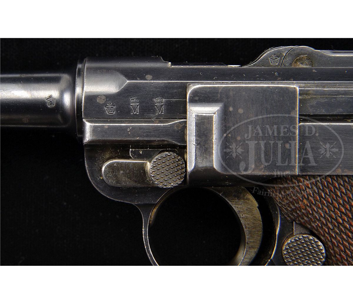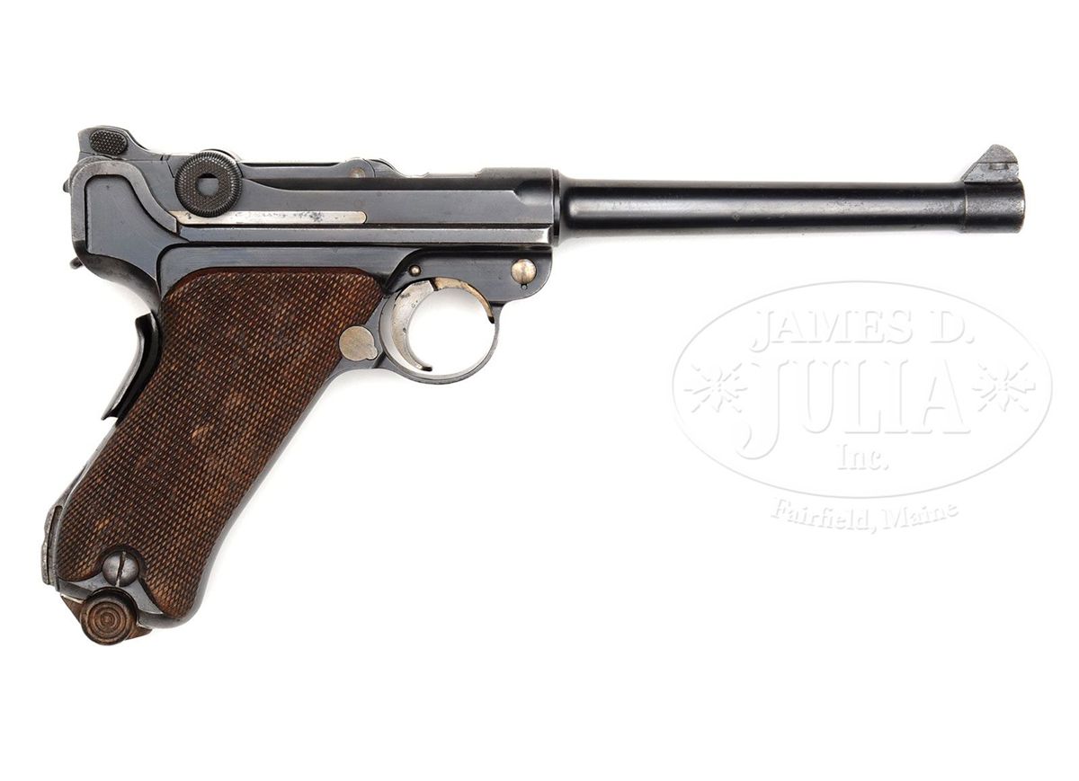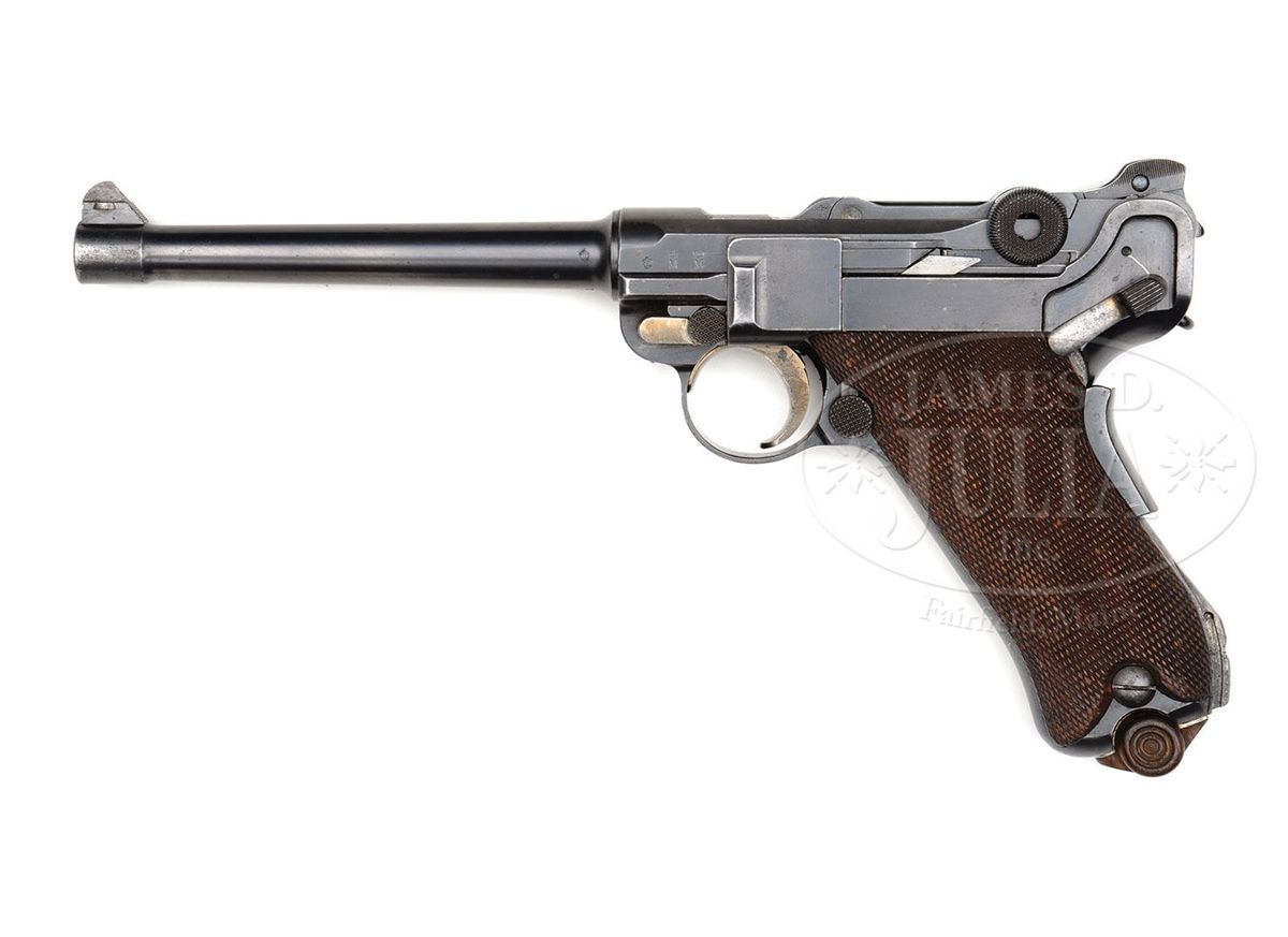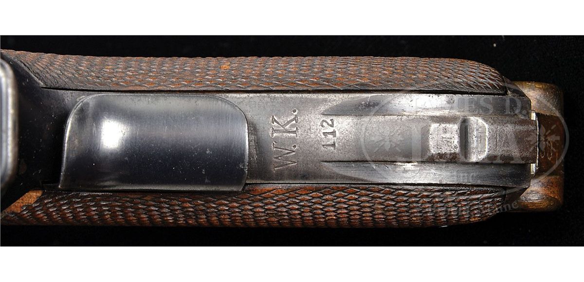 SN 461. 6" 9mm bbl. "DWM" on center toggle link. 100 meter/200 meter adjustable Navy rear sight. Crown M Proofs on receiver and bbl. Grip safety. "Gesichert" remains in lower position and has not been removed as has been done on most surviving examples of this model. Unit marked "W.K./112" (Kiel Dockyard Weapon Number 112) on lower rear grip strap. All numbered parts on the gun are matching. Proper concentric ring wood bottom magazine does not match. This gun is featured on pp. 272, 306, 568, 635, 872, 879, and 903 of Dr. Geoffrey Sturgess' The Borchardt & Luger Automatic Pistols. PROVENANCE: Collection of Dr. Geoffrey Sturgess. CONDITION: Very fine retaining 95% orig blue and 60% orig straw with some areas of light scattered pitting common on guns exposed to sea air. Bore is lightly worn with light pitting. Checkered walnut grips are worn, with minor chips to checkering, and a chip under the safety. Magazine is excellent with a few minor dings on the front of the body. Mechanics are sound. 4-52900 BWS45