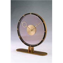 KIENZLE UHRENFABRIK AG., Schwenningen Heinrich Möller Tischuhr, Glas, Metallguss. Über querovaler Plinthe mit zwei Stegen kreisförmiger Rahmen mit reliefierten, römischen Ziffern, darin zwei Glasscheiben, dazwischen Uhrwerk und Zeiger. 2 min. Kratzer. H.: 25 cm. Bez.: Kienzle (gedruckt). 1930er Jahre