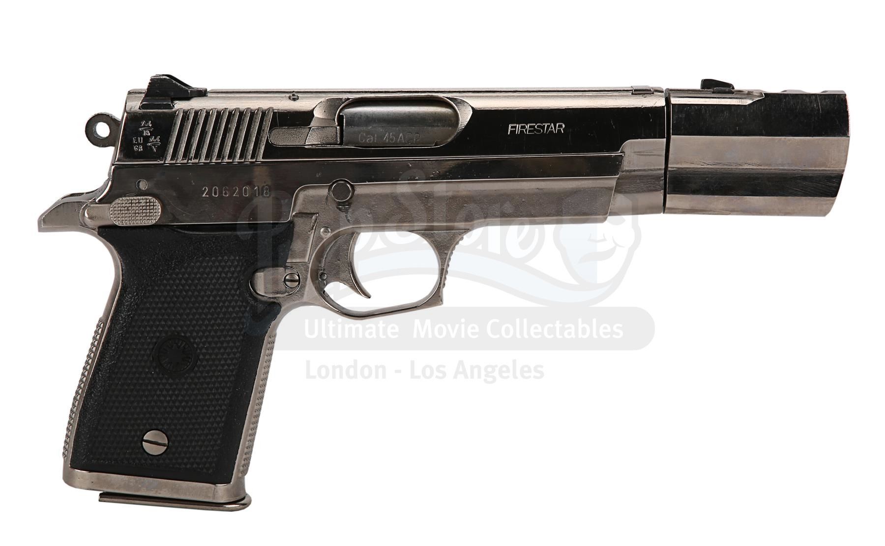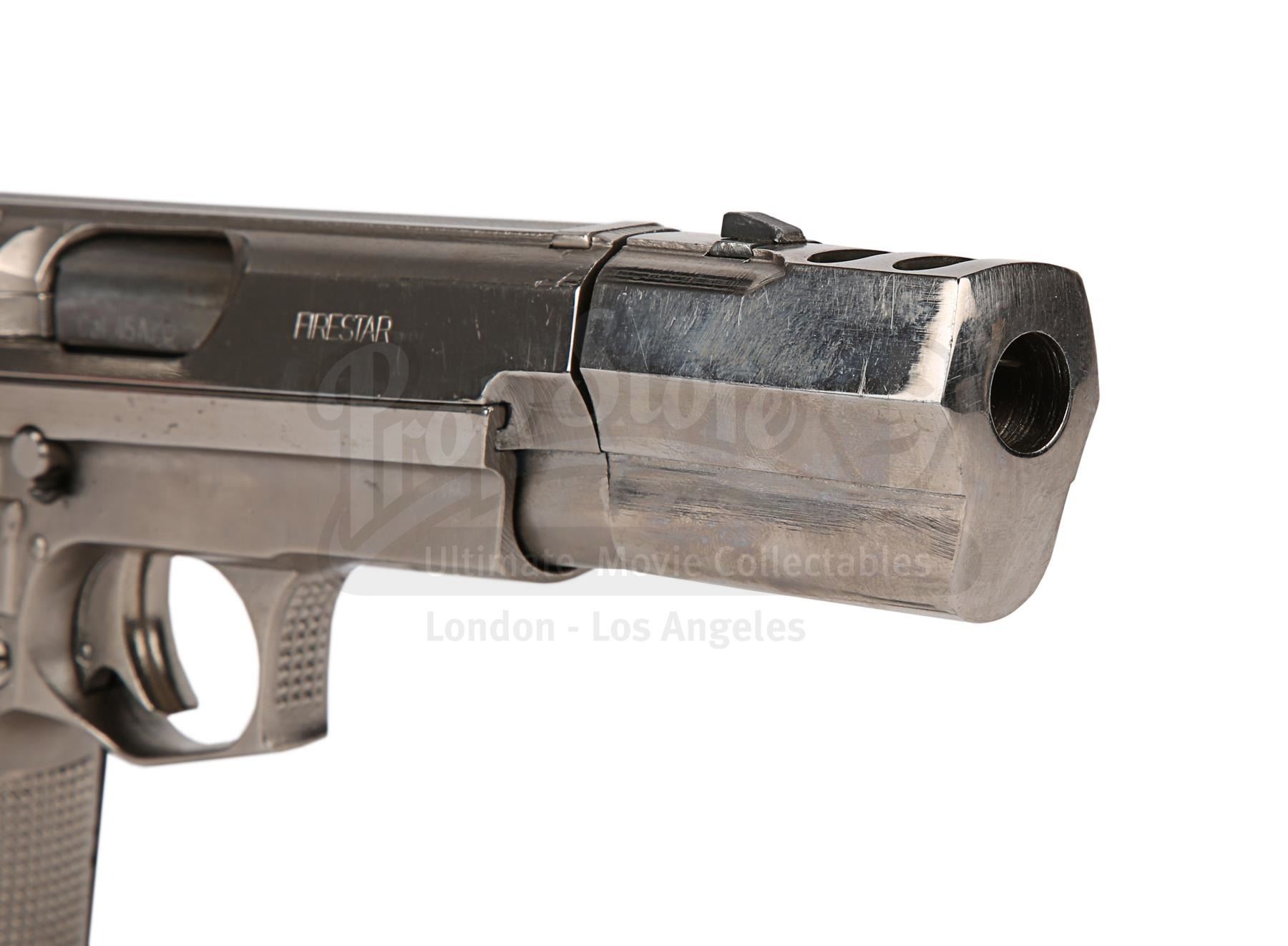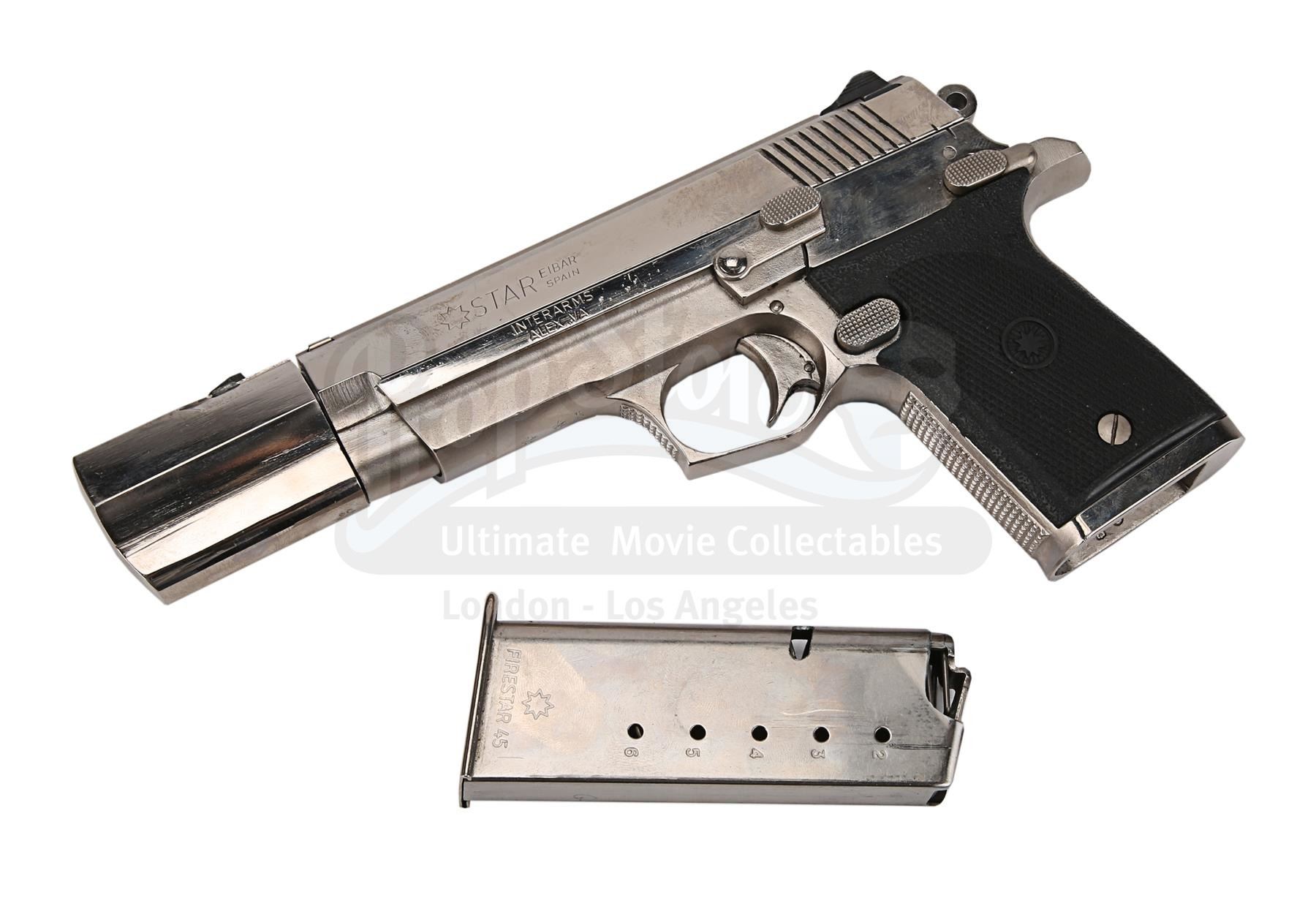 The pistol is a Star Firestar M45 with a custom extended barrel, which can be unscrewed and removed. The gun features a stainless steel finish with a plastic textured grip and is engraved with the serial number "2062018". It has been sympathetically deactivated, with the magazine release, hammer, safeties and trigger still functional, though the barrel of the gun is blocked and the slide no longer moves. It is accompanied by an official deactivation certificate.
