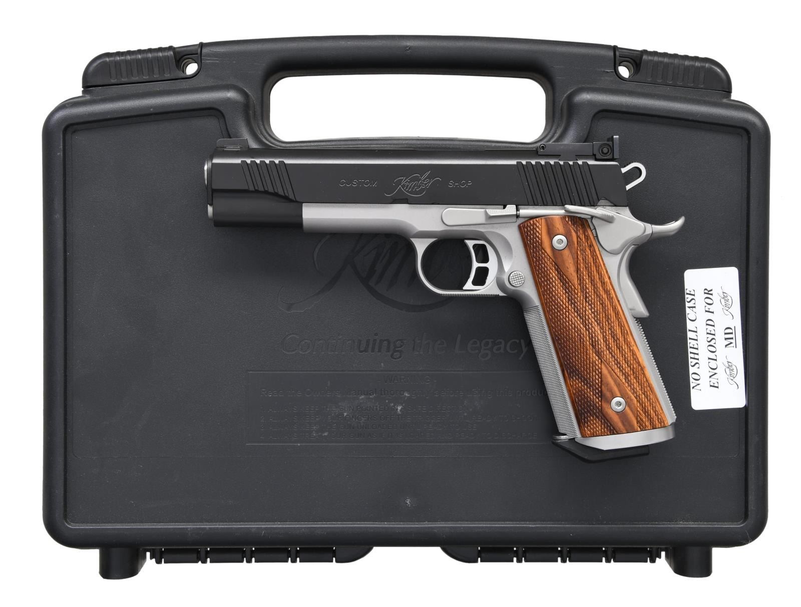 PISTOL. Cal. 45 ACP. S# K469426. Bbl. 5". Blade front sight. Adjustable rear sight. High-end Kimber custom shop competition pistol. Extended ambi safety. Extended beavertail grip safety. Matte black frame. Stainless frame. Checkered fancy walnut grips. MAGS: 1-7 rd. UNATTACHED ACCESSORIES: matching-numbered factory hardcase w/ manual, paperwork, factory test target, & bushing wrench. CONDITION: all aspects are near excellent. PROVENANCE: the collection of Gun Sport Ltd., owned by Jon R. Thomas. (23-4083/MJC). MODERN. $1,000-1,500.