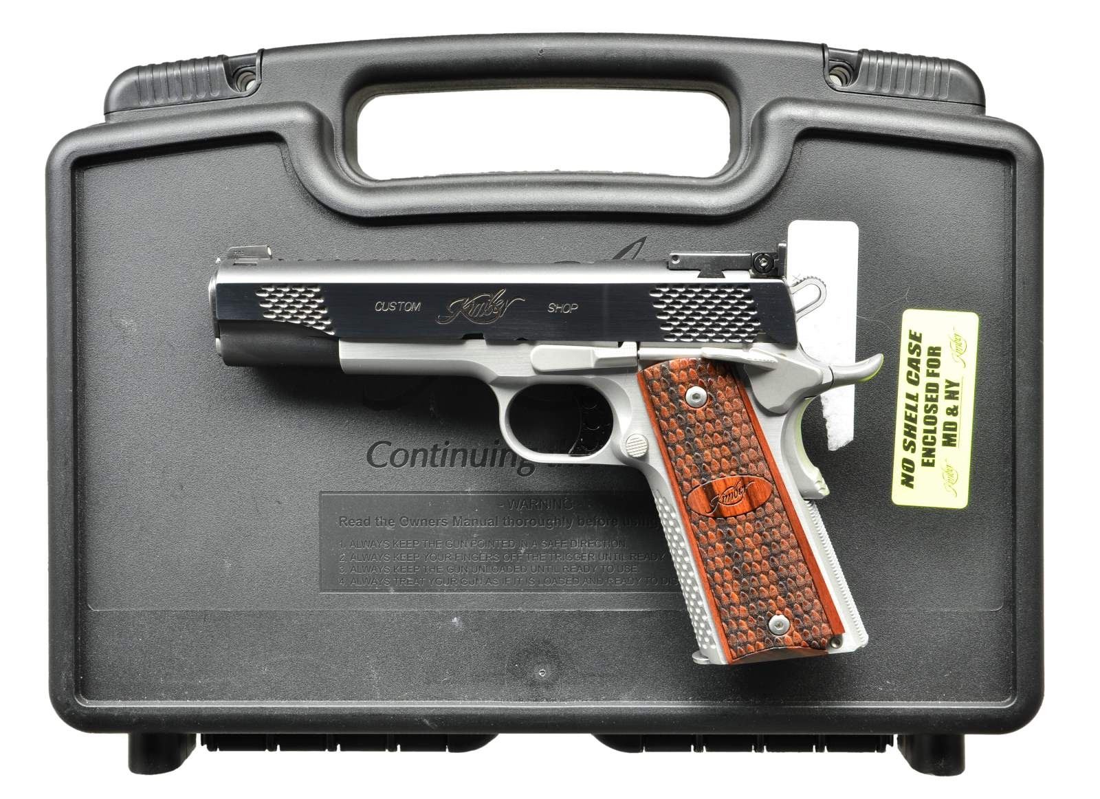 KIMBER GRAND RAPTOR II SEMI AUTO PISTOL. Cal. 45 ACP. S# K205090. Bbl. 5”. Custom shop mfg. full sized 1911 with stainless steel frame and blued slide with flats polished. Attractive two tone finish with fixed front sight and adjustable rear sight. Beavertail grip safety, ambidextrous safety and Commander style hammer. Top, front and rear of slide and front gripstrap are scaled with checkered mainspring housing. Grips are scaled rosewood with Kimber logo. MAGS: 1-7 rd. factory. UNATTACHED ACCESSORIES: Factory black hardcase serial numbered to the pistol, safe chamber indicator, bushing wrench, lock, oil and paperwork. CONDITION: All aspects near excellent showing little indication of use. Bore is near excellent, bright and strong. (22-2973/CW). MODERN. $800-1,200.