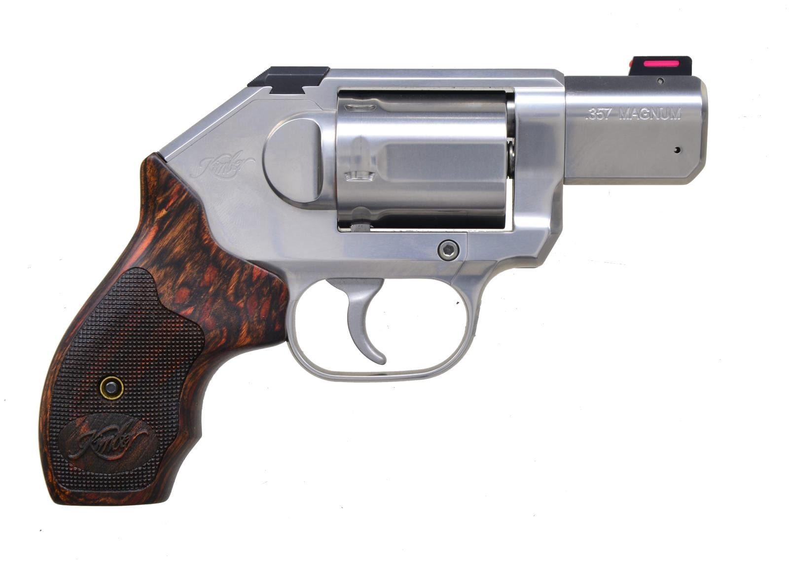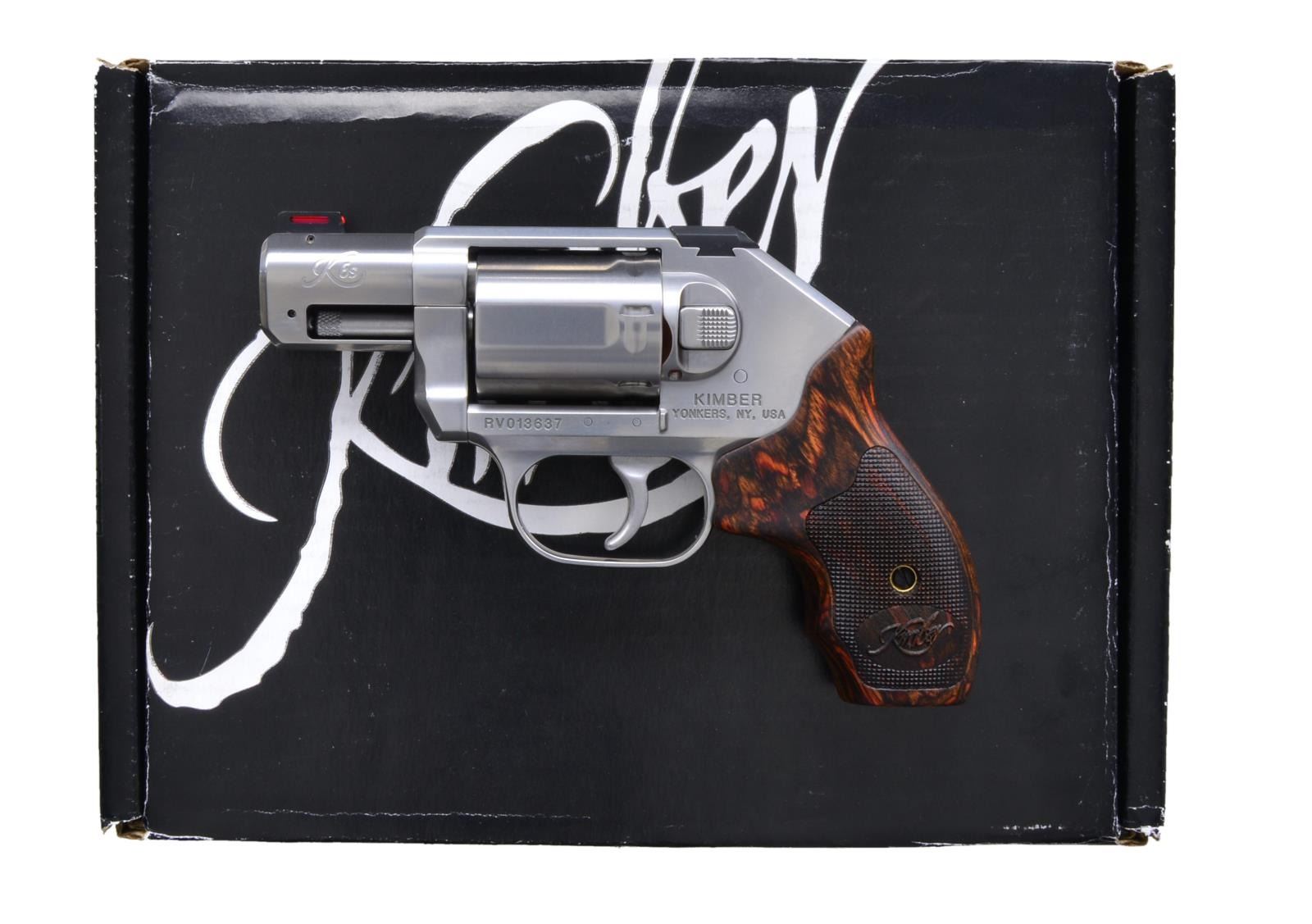 KIMBER K6S DCR DA REVOLVER. Cal. 357 Mag. S# RV013637. Bbl. 2”. Deluxe Carry Revolver with stainless steel construction, 6 shot cylinder, red fiber optic front sight and black rear. Grips are checkered Millenium rosewood and finish is a smooth satin. UNATTACHED ACCESSORIES: Factory cardboard box serial numbered to the revolver with zippered soft case, manual, lock and paperwork. CONDITION: All aspects near excellent showing light use only. Bore is near excellent, bright and strong. (22-2933/CW). MODERN. $600-800.