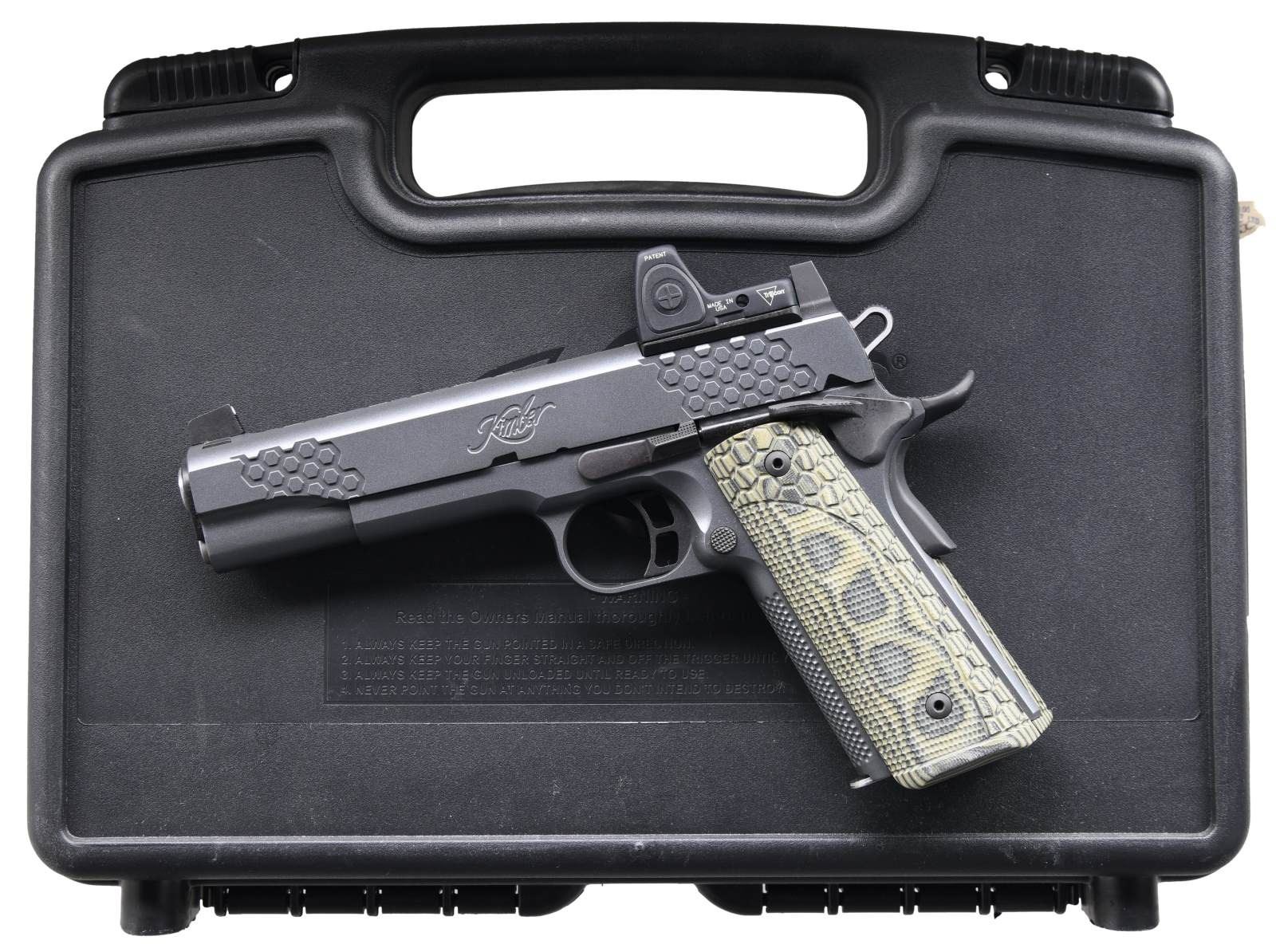 Cal. 45 ACP. S# K885360. Bbl. 5". Three dot sights. Slide-mounted Trijicon RMO6 red dot sight. Gray finish. Extended right safety. Extended beavertail grip safety. Matte gray finish. Hogue G10 Mag grips. MAGS: 1-7 rd. UNATTACHED ACCESSORIES: matching-numbered factory hardcase w/ manual, cable lock, paperwork, & bushing wrench. CONDITION: all aspects are near excellent. PROVENANCE: the collection of Gun Sport Ltd., owned by Jon R. Thomas. (23-3859/MJC). MODERN. $1000-1500.