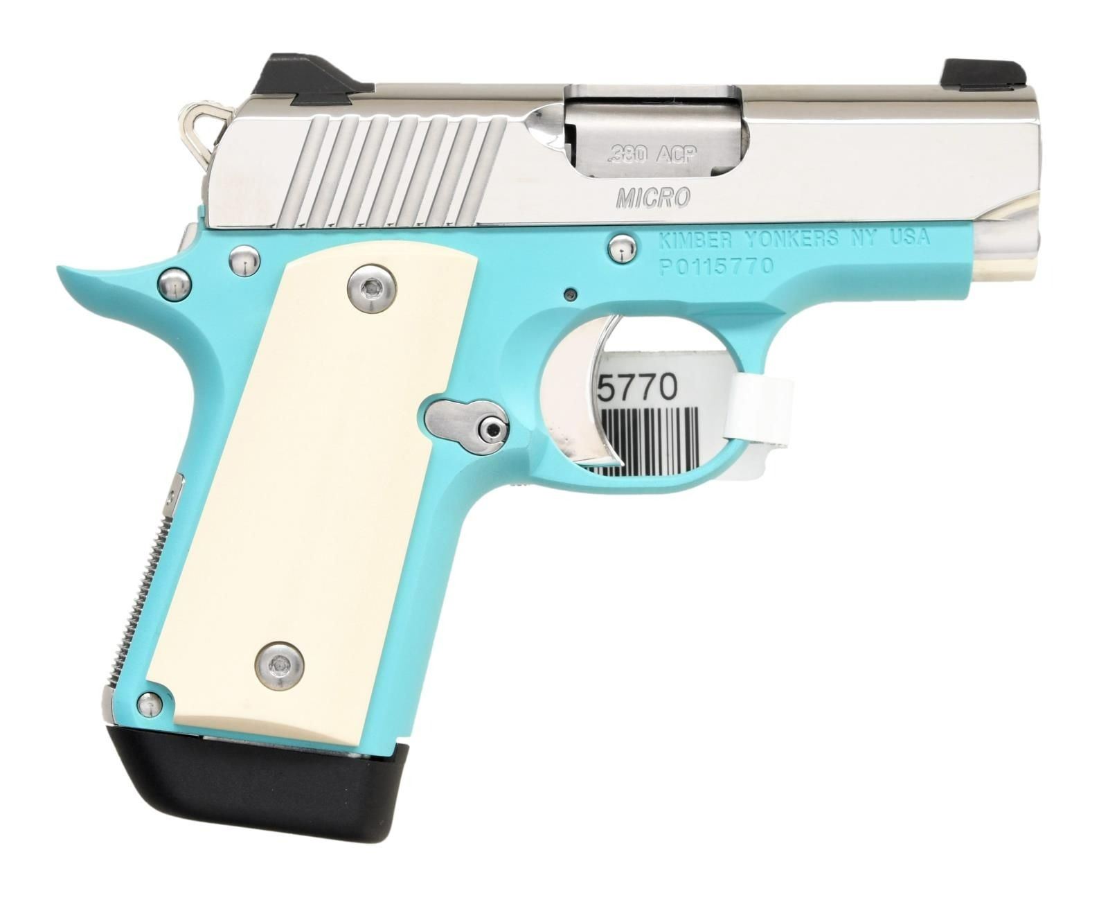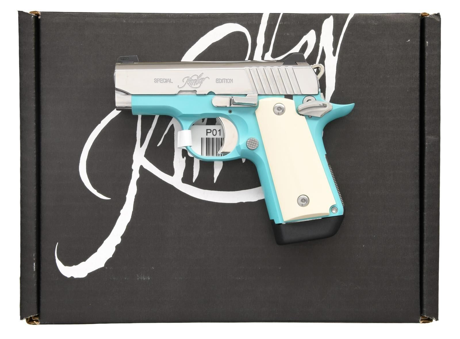 Cal. 380 ACP. S# P0115770. Bbl. 2 3/4". Three dot night sights. Mirror polished slide w/ rear serrations. Bel Air blue finished frame. Factory hang tag present on trigger guard. Ivory colored Micarta grips MAGS: 1-7 rd. w/ black baseplate. UNATTACHED ACCESSORIES: factory box matching numbered to gun w/ soft case, manual, paperwork & cable lock. CONDITION: all aspects near excellent. PROVENANCE: The Collection of Gun Sport Ltd owned by Jon R. Thomas. (23-2945/MJC). MODERN. $700-100.