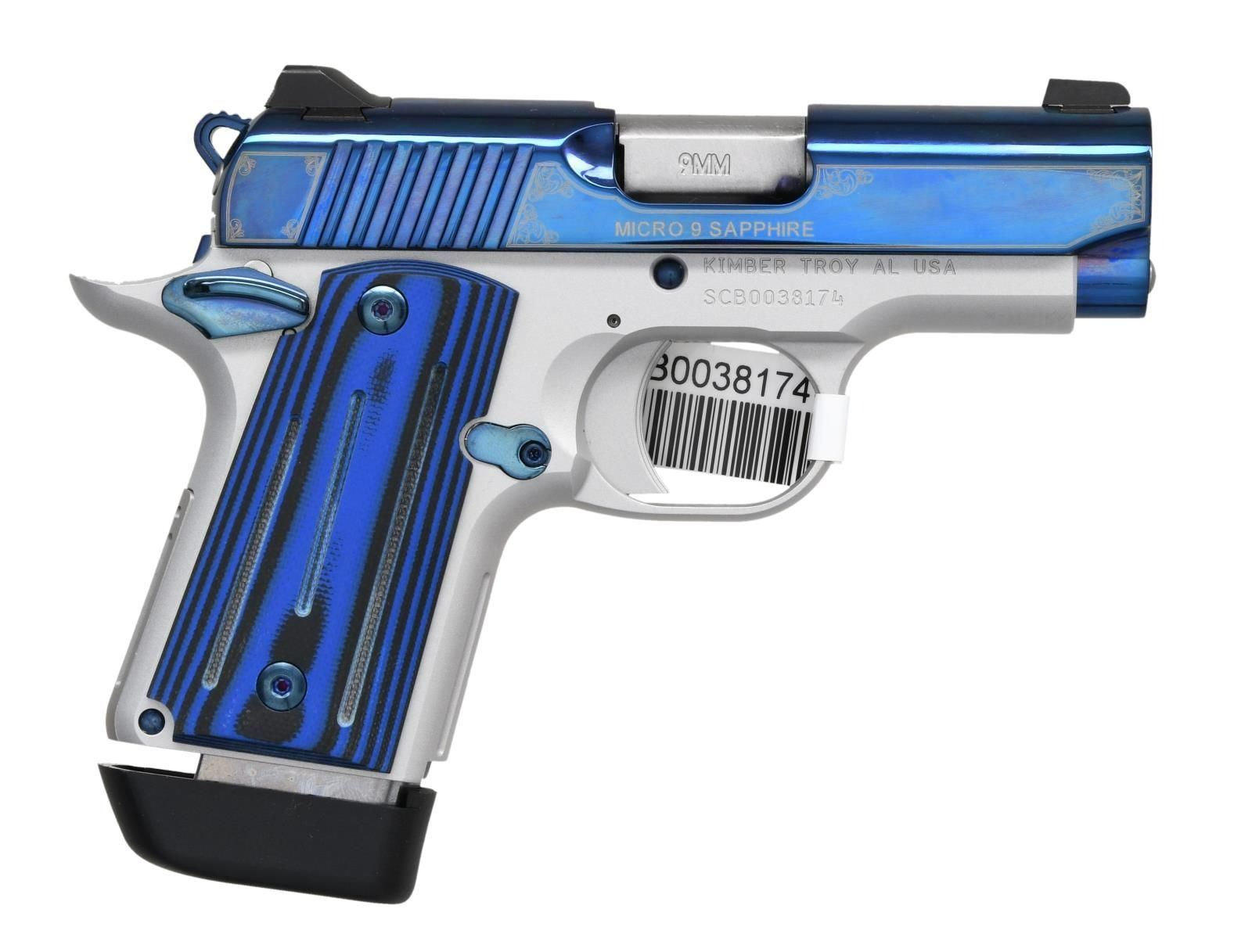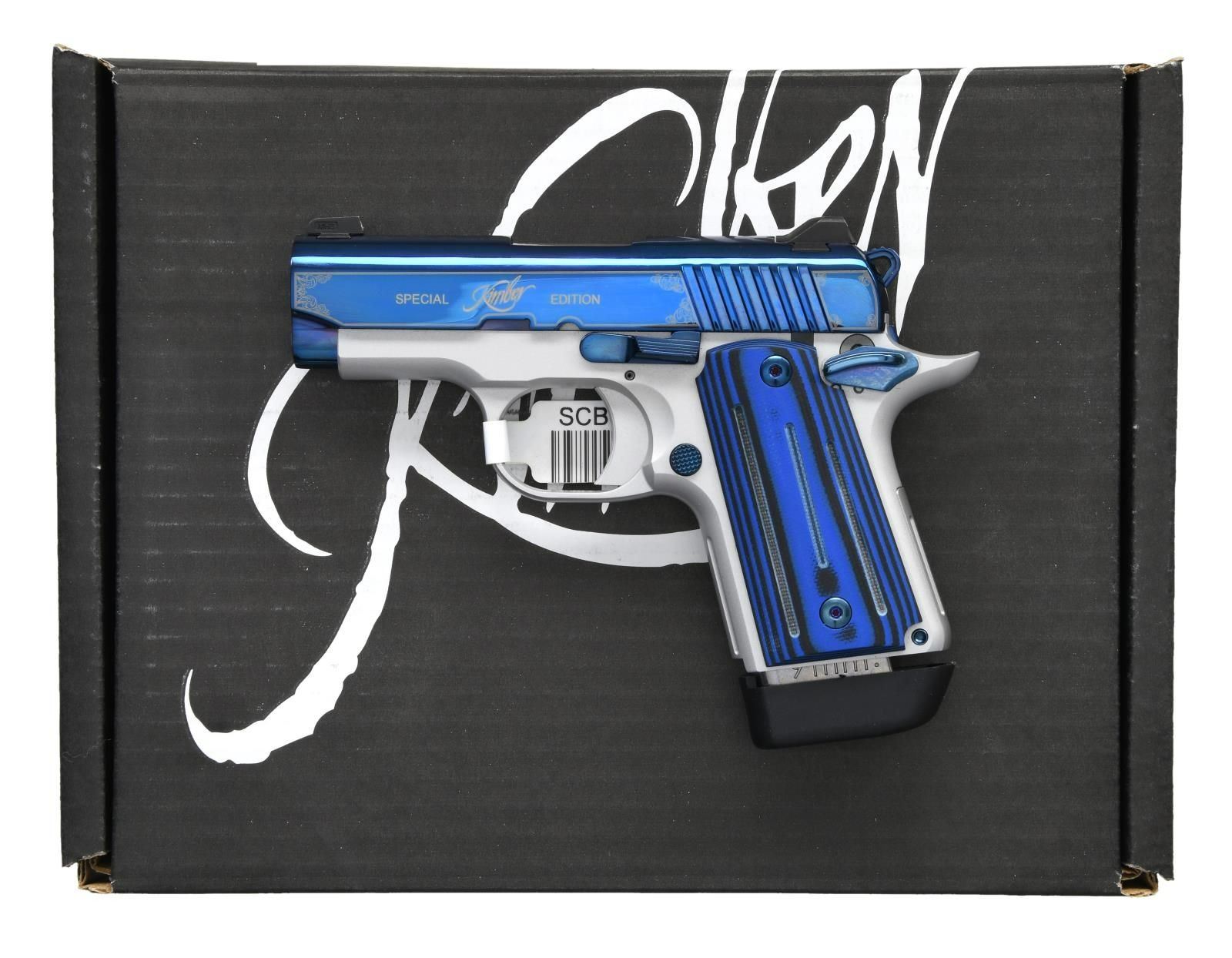 Cal. 9mm Luger. S# SCV0038174 . Bbl. 3 1/4". Three dot night sights. Bright blue PVD finished slide w/ floral accents. Satin silver aluminum frame. Ball milled blue G10 grips. MAGS: 1-6 rd. factory. UNATTACHED ACCESSORIES: matching numbered box w/ softcase, manual, paperwork, & cable lock. CONDITION: all aspects near new, in the box. PROVENANCE: the Collection of Gun Sport Ltd owned by Jon R. Thomas. (23-2878/MJC). MODERN. $800-1200.