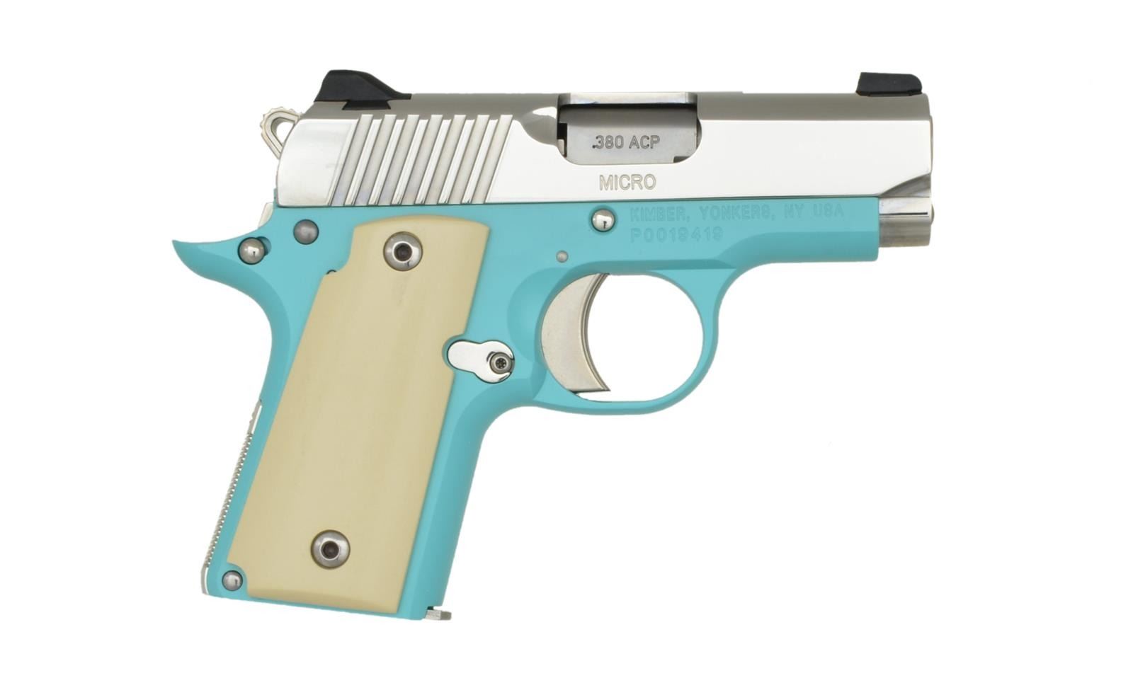 KIMBER MICRO BEL AIR SEMI AUTO PISTOL. Cal. 380 ACP. S# P0019419. Bbl. 2 3/4". Special Edition micro pistol with Bel Air Blu KimPro II finished frame and polished stainless steel slide that holds fixed low profile sights. Rear slide serrations and checkered mainspring housing with ivory Micarta smooth grips. MAGS: 1-6 rd. factory. UNATTACHED ACCESSORIES: Factory cardboard box serial numbered to the pistol with zippered soft case, manual, lock, oil and paperwork. CONDITION: All aspects near excellent showing no evidence of use. Bore is near excellent, bright and strong. (22-2919/CW). MODERN. $500-700.