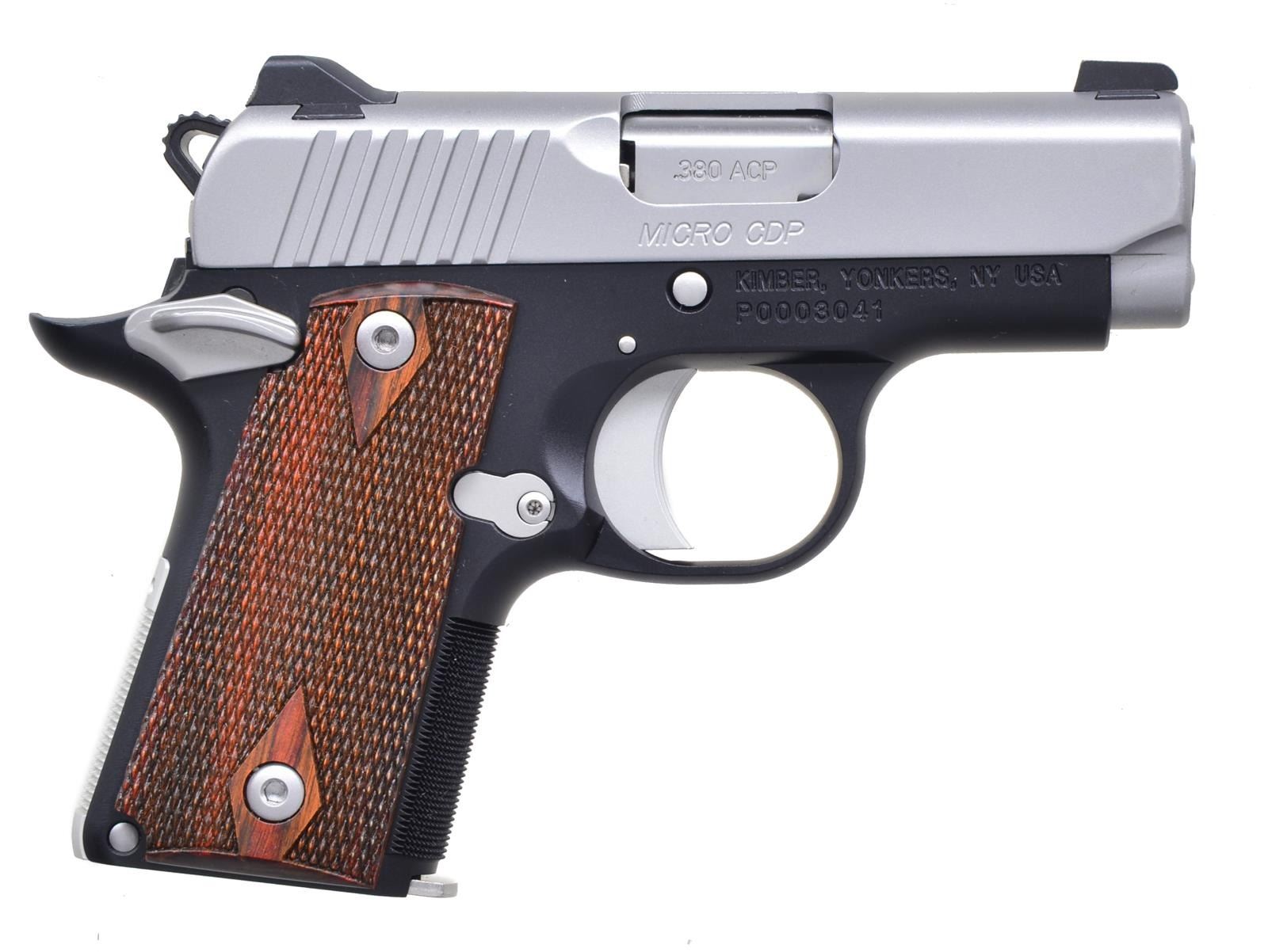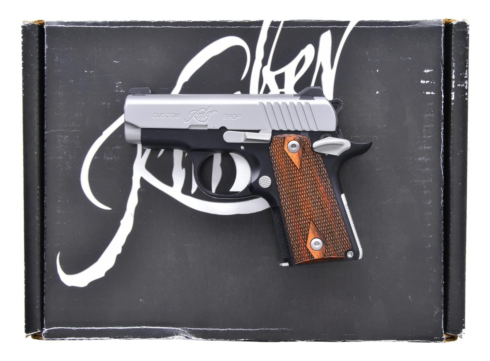 Cal. 380 ACP. S# P0003041. Bbl. 2 3/4". Custom shop pistol with stainless steel construction and nice two tone appearance with matte black frame and stainless slide. Fixed ramp front sight with notch rear and night sights that do glow but are quite faint. Commander style hammer, ambidextrous safety, stippled frontstrap and mainspring housing. Double diamond checkered wooden grips. MAGS: 1-6 rd. factory. UNATTACHED ACCESSORIES: factory cardboard box serial numbered to the pistol, zippered soft case, manual, lock, oil and paperwork. CONDITION: all aspects near excellent, showing little evidence of use. Bore, near excellent, bright and strong. (22-2940/CW). MODERN. $500-700.
